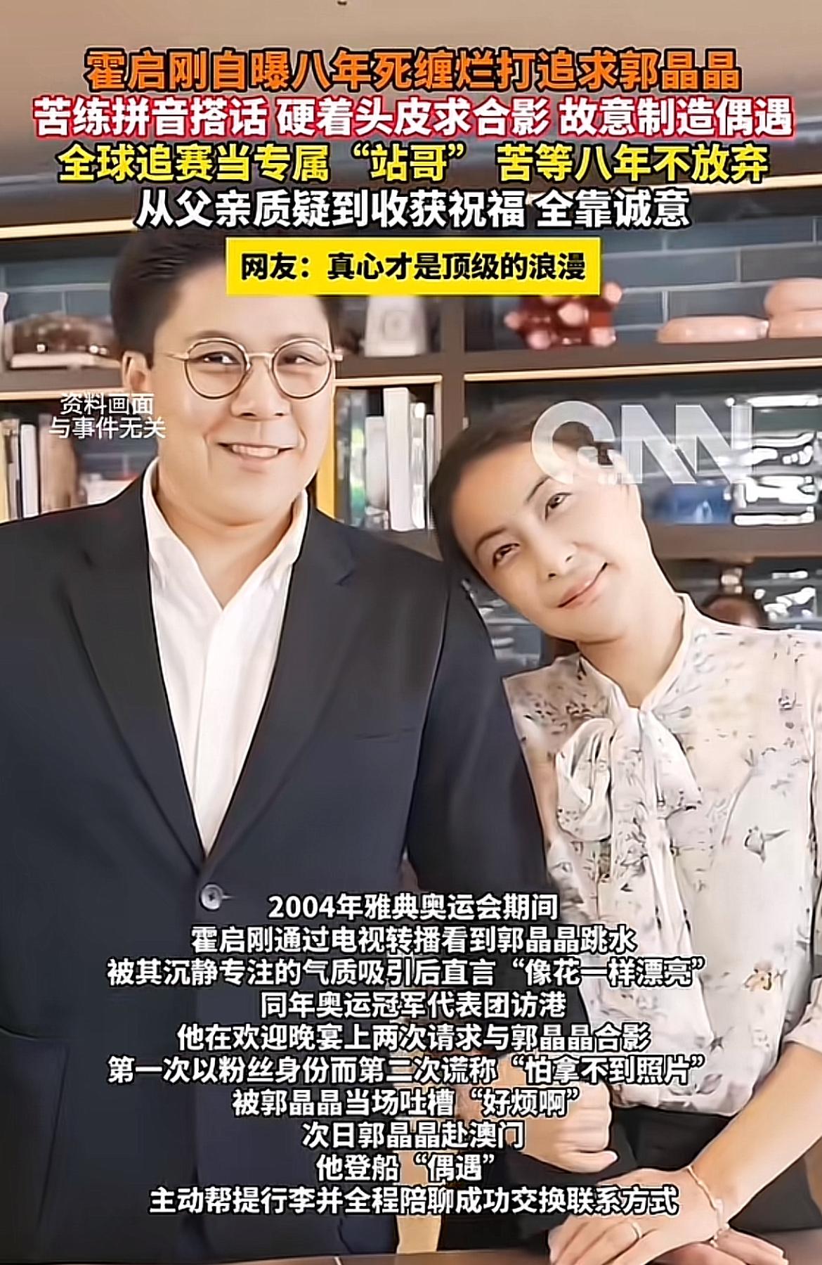 霍启刚苦追郭晶晶八年的故事太好磕了!2004年雅典奥运后香港的晚宴上,霍启刚对郭晶晶一见钟情。平时极少主动合影的他,鼓起勇气求拍,五分钟后还折返再拍,被郭晶晶吐槽“好烦”。次日乘船去澳门,他又买到同船票,坐邻座帮忙提行李,一小时航程不停找话题,顺利要到联系方式。 郭晶晶是拿了77枚金牌的“跳水女皇”,霍启刚出身豪门却没架子。他为拉近和郭晶晶的距离下足功夫,甚至学普通话。八年死缠烂打,终抱得美人归,这爱情太让人羡慕啦!