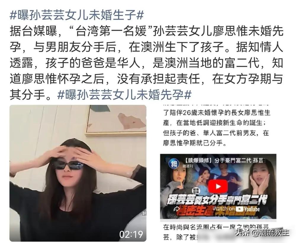 孙芸芸女儿未婚生子,通稿都在夸她家“开明”。我看笑了,这哪是开明,这是拿钱砸出来的体面,懂的都懂。 女儿廖思惟在澳洲,让个富二代男友搞大了肚子,男的转头就跑路失联。孙芸芸立马停工飞过去,全程陪产当“台佣”,这不是母爱,这是危机公关的黄金操作。 换个普通人家试试?早就天塌了。可人家是40亿的盘子,孩子跟妈姓照样是接班人。那点所谓的“丑闻”,在资本面前,水花都溅不起来,就离谱。 说到底,让一个豪门显得“开明”的,从来不是心态,是钱。是能把任何事故,都硬生生砸成故事的底气。