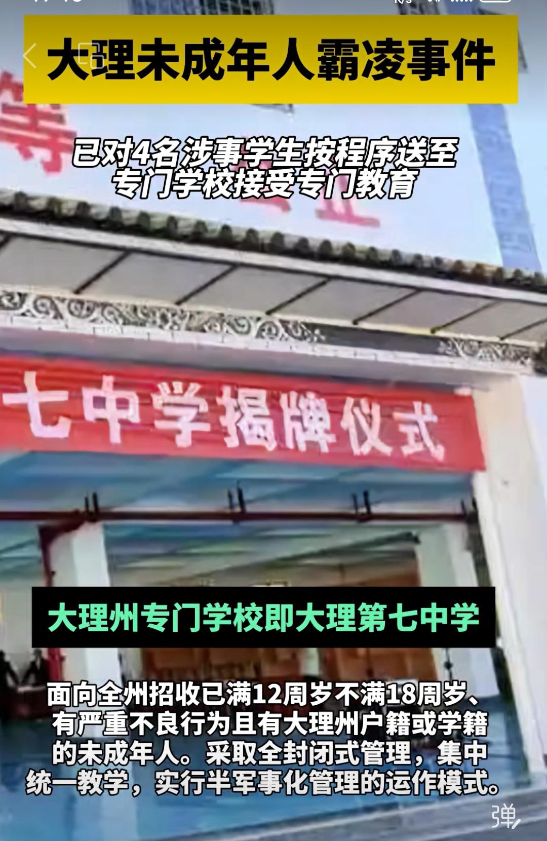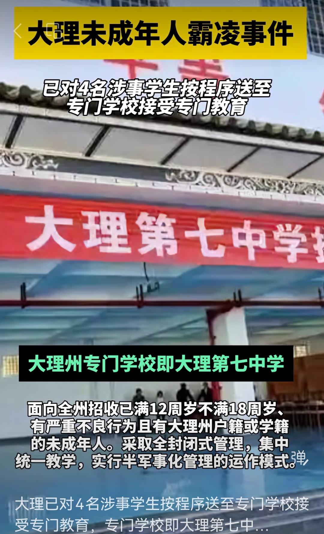 大理“一女学生被多人殴打”事件终于有了处理结果。 事情发生于2025年12月11日,4名学生因口角在校外对一名女生进行打骂。学校老师当时虽进行了批评教育,但事后既未通知家长,也未报告主管部门。直至2026年3月23日家长报警,相关部门才全面介入。 如今,4名涉事学生被送往大理第七中学这所专门学校接受教育,15岁的涉事学生还受到了行政处罚。大理也启动了对学校及相关人员的责任追究。希望此次处理能给予涉事学生改过的机会,也为校园安全和未成年人教育敲响警钟。 专门学校