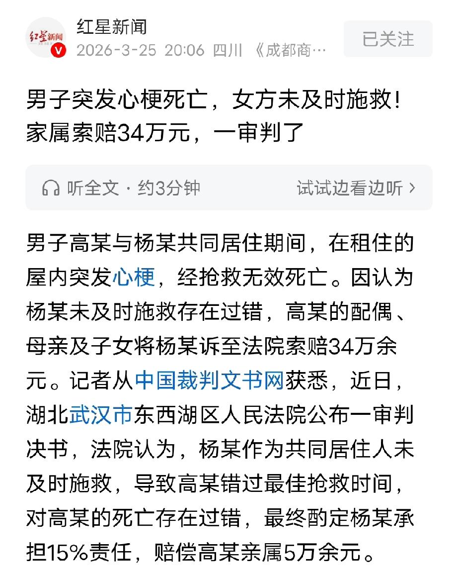 湖北武汉,女子跟已婚男子租房同居,不料男子上厕所时突然倒地不醒,女子吓得赶紧去找房东,可房东已经睡了,她悻悻而归,回来后越想越害怕再次去喊房东帮忙,没想到,等房东来到后,男子已经没了呼吸。家属悲痛欲绝,认为是女子没有及时施救并拨打急救电话,把她告上法庭34万,法院最终这么判。 2025年4月27日晚上,杨女士已经躺在床上了,突然她听到“砰”的一声响。 杨女士女士吓得打了一个机灵,她立马喊男友“高××”,可是没人答应她,杨女士再喊了3遍都得不到应答后,开始慌了,她赶紧跑出房间去看。 当她来到客厅,发现客厅空无一人,她又喊了一下男友名字,他都没有出声,这时她发现厕所的灯亮着。 杨女士赶紧冲到厕所,眼前出现了让她惊恐的一幕,只见男友高先生躺在地上,无论杨女士怎么呼喊,他都一动不动。 原来高先生是背着老婆在外跟相好王女士租房,两人常常在租房里约会。 杨女士怎么也没想到,身体一向很好的高先生会出事。 她看到高先生躺倒在地那一刻,吓得浑身颤抖,话都说不出来,她强行让自己冷静下来后,用尽全身力气,把高先生抗到床上,让他平躺着。 杨女士看高先生没反应,脸色苍白,担心他出事,她赶紧跑上楼找房东林某帮忙。 不料,杨女士在敲开房东家的门时,开门的是他们儿子,孩子跟杨女士说我爸妈已经睡了。 杨女士不想叫醒他们,怕麻烦人家,所以灰溜溜回去了。 可杨女士回家后,看高先生脸色越来越不对劲,她顾不了那么多,再次跑上楼叫房东。 房东跟杨女士到她家后,发现高先生脸色惨白,一动不动,吓得他赶紧给高先生做心肺复苏,高先生的老婆则立马打120急救电话。 医生来得很及时,前后不到10分钟的时间,可遗憾的是,高先生经过抢救后最终还是离世了。 高先生的妻子、孩子还有他父母得知这个消息,感觉天都要塌下来了,好好的一个人怎么说没就没了。 家属一致认为,都是因为杨女士没有及时报警害的,杨女士作为同居人,没有尽到及时救助义务,所以她得负责。 家属要求杨女士赔偿费用34万元。 有人说,这事说白了就是:谁有错害了别人,就得承担责任。 法院经过审理认为,高某跟杨某虽然不是夫妻,但俩人一直住在一起,关系很亲近。当时高某生命垂危,屋里就杨某一个人知道情况,他理应赶紧想办法救人、叫急救。 可根据急救记录和房东的说法,医护人员赶到的时候,离高某出事已经快40分钟了,那时候人早就没了呼吸心跳。就是因为杨某没及时施救,耽误了最佳抢救时间,他对高某的死是有过错的,所以必须赔钱。 不过高某本身是急性心梗去世,自己要负主要责任。法院最后判杨某承担15%的责任,赔偿高某家属一共51843块钱。 《民法典》第1165条第1款规定,行为人因过错侵害他人民事权益造成损害的,应当承担侵权责任。 本案中高某与杨某长期共同居住,关系紧密,高某突发心梗生命垂危时杨某是屋内唯一知情者,负有及时呼救救助的义务,但其拖延近40分钟未采取任何有效施救措施,直接导致高某错过最佳抢救时机,存在明显过错,符合本条过错侵权的构成要件。 因为高某死亡主要原因是自身急性心肌梗死,自身承担主要责任,法院结合案情酌定杨某承担15%的赔偿责任,赔偿高某亲属各项损失共计51843元。 对此,大家怎么看?