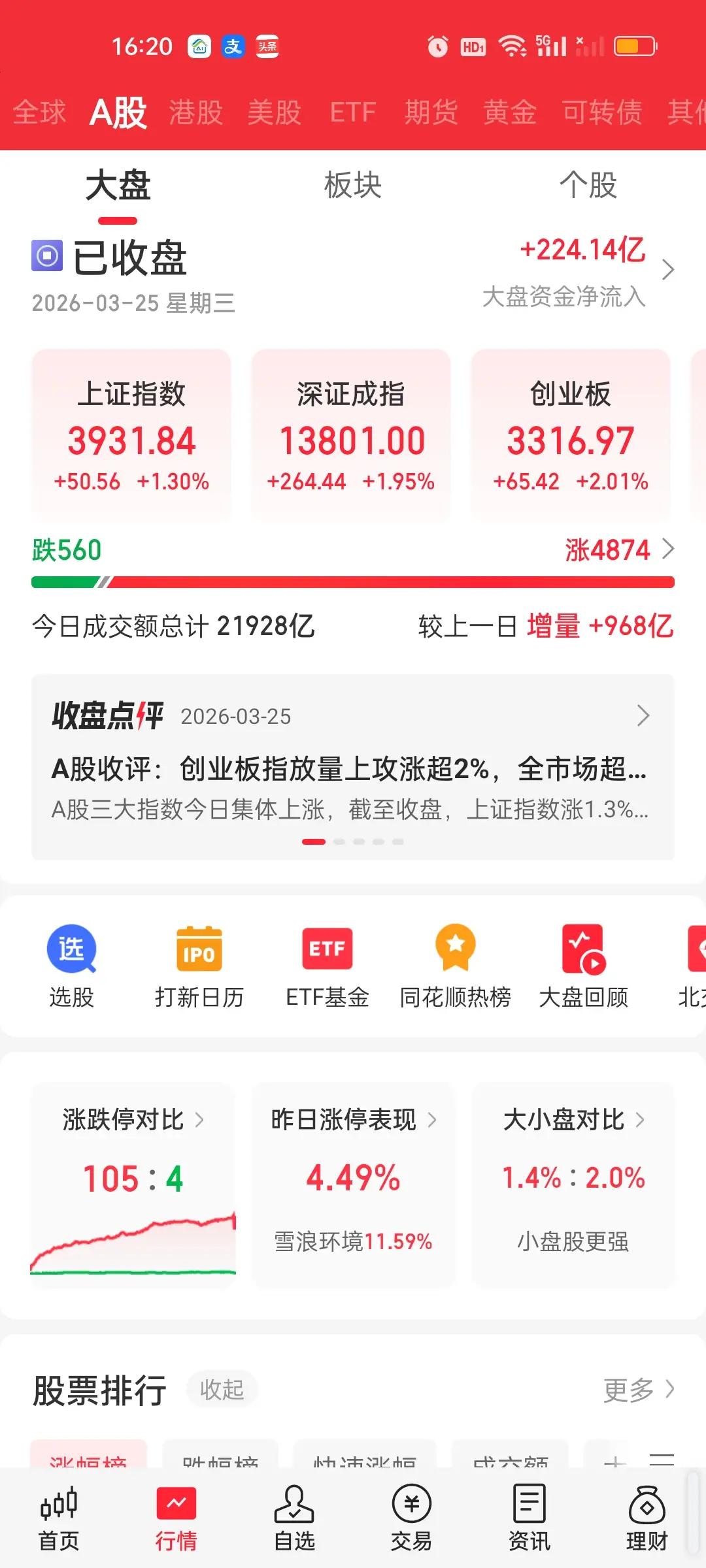 下午成交量还是明显缩量的,但好在今天市场情绪非常好,指数没有因为缩量而回落,上涨家数和涨停家数反而还增加了。我们知道成交量与上涨家数是两个非常重要的指标,一个代表市场活跃度,一个代表市场情绪。只要市场情绪很好,哪怕缩量指数依旧可以上去。同样的市场情绪很差,哪怕大幅放量,大盘也有可能有很多家跌停。 明天还是要关注成交量。1507-968=539亿。今天其实开盘半个多小时就放量了1300亿,但全天只放量了968亿。等于说后面的3个多小时反而缩量了300多亿。全靠做多情绪撑着。市场没有出现下跌。今天买的大概率不会是机构,明天很大概率会发生分歧,产生分化。最起码上涨家数是很难达到4000家以上了。