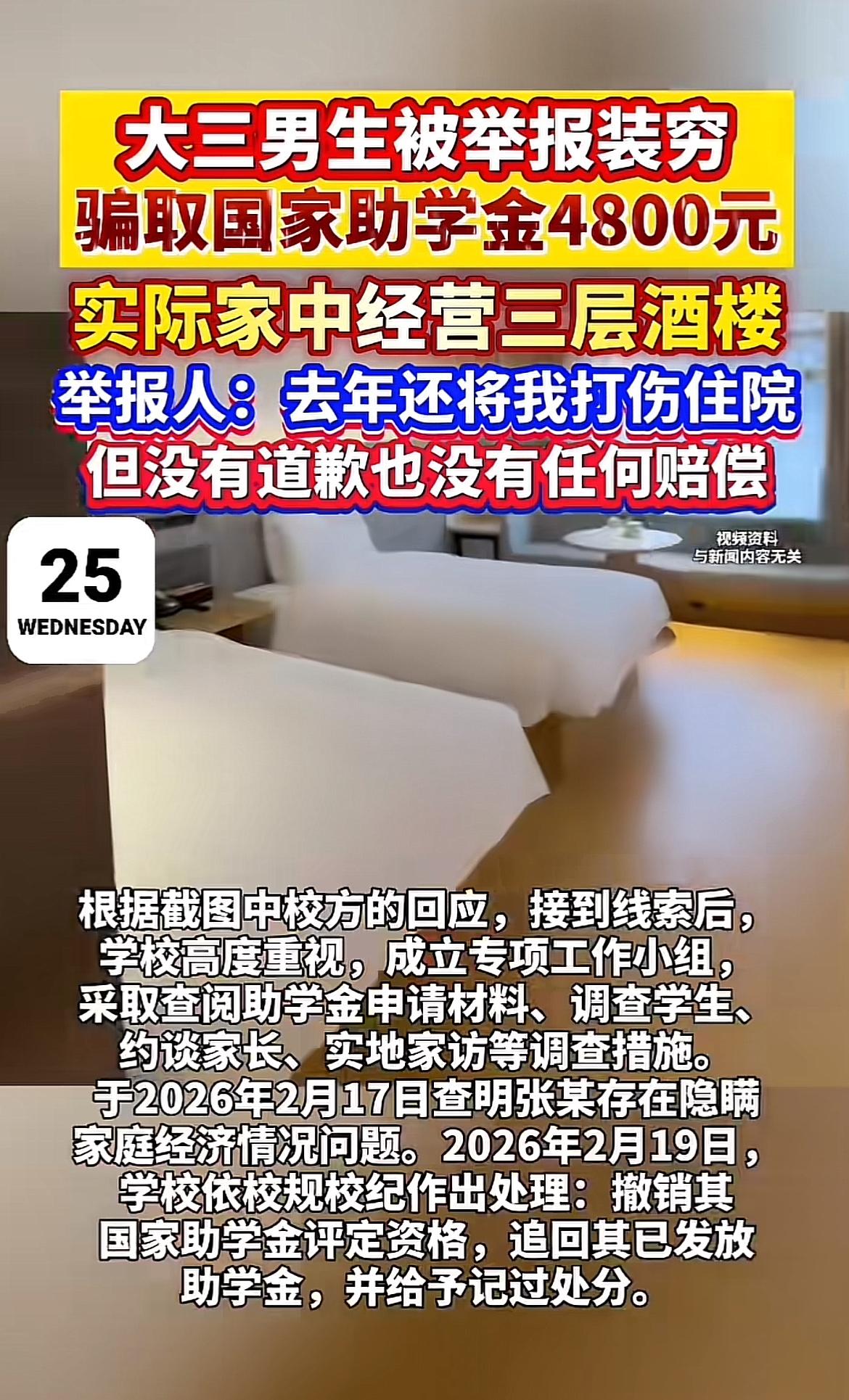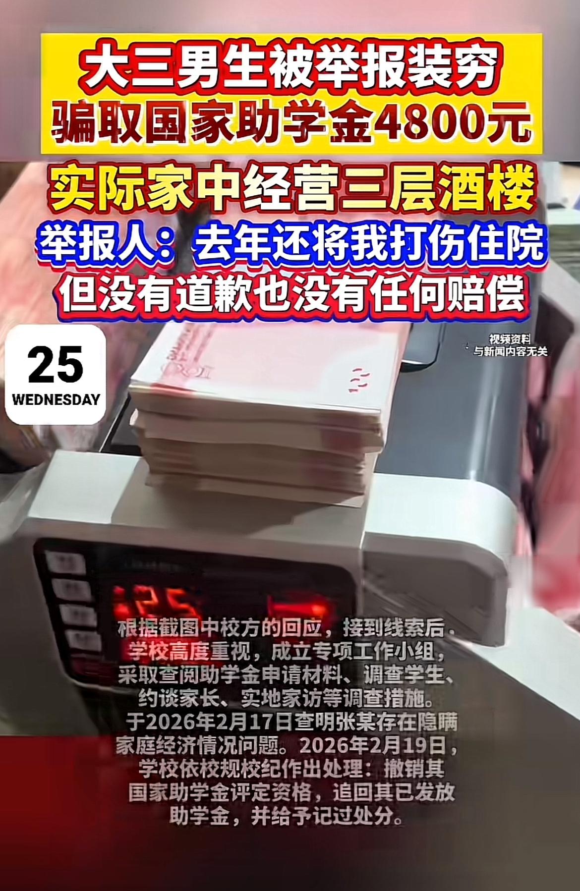 河北金融学院这事儿真让人无语。大三学生张某家里经营三层酒楼,却虚构贫困骗取4800元助学金。举报人申同学也是倒霉,因占座和张某起冲突,被打伤住院花了8万多医疗费,张某却不道歉不赔偿。 申同学气不过实名举报,学校调查后撤销张某助学金资格,追回钱款还给他记过处分。更离谱的是,涉事酒店近期改名换经营者了。目前申同学准备民事诉讼索赔。这张某为了钱,不仅侵占公共资源,还打人耍赖,实在是没诚信、没品行,该受到惩罚!