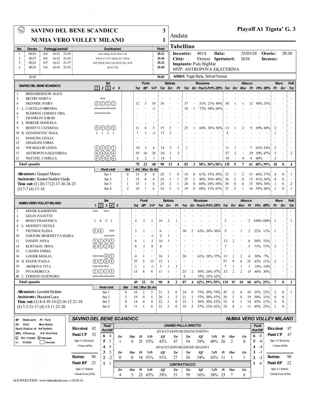 斯坎迪奇扳回一城,双方战成1-2 2025-2026女排意甲半决赛第三轮,斯坎迪奇主场3-1击败米兰扳回一城,双方战成1-2,四局比分25-21, 24-26, 25-22, 25-20。奥格涅诺维奇打满全场,安娃35得分王并MVP,埃格努27分。 斯坎迪奇: 安特罗波娃57扣29中2失0被拦、3拦3发35分 斯金纳30扣12中1失1被拦、0拦0发12分 波塞蒂13扣9中1失2被拦、2拦0发11分 恩瓦卡洛11扣7中1失0被拦、2拦1发10分 魏策尔10扣4中0失4被拦、2拦0发6分 奥格涅诺维奇4扣0中0失0被拦、1拦0发1分 米兰: 埃格努57扣25中9失4被拦、2拦0发27分 皮瓦32扣15中2失2被拦、0拦0发15分 库尔塔吉奇7扣5中0失0被拦、3拦0发8分 达内西12扣6中2失0被拦、0拦0发6分 博西奥2扣2中0失0被拦、1拦2发4分 拉尼尔13扣4中1失2被拦、0拦0发4分 皮特里尼9扣2中0失1被拦、1拦0发3分 阿基莫娃7扣1中1失1被拦、0拦1发2分 斯坎迪奇-米兰: 进攻得分:61-60 拦网得分:10-7 发球得分:4-2 对方送分:24-20 总得分:99-89 一传到位率:58%-62% 一传完美率:30%-29% 意甲女排总决赛 斯坎迪奇