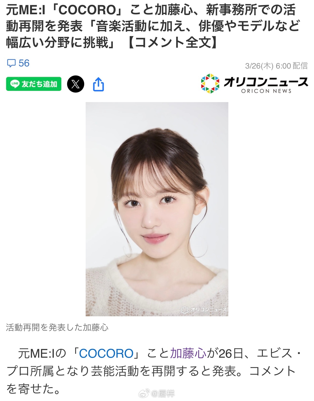 前ME:I成员、有着“COCORO”之称的加藤心于26日宣布,签约EBISU Pro事务所,重启演艺活动,并发表了相关感言。
