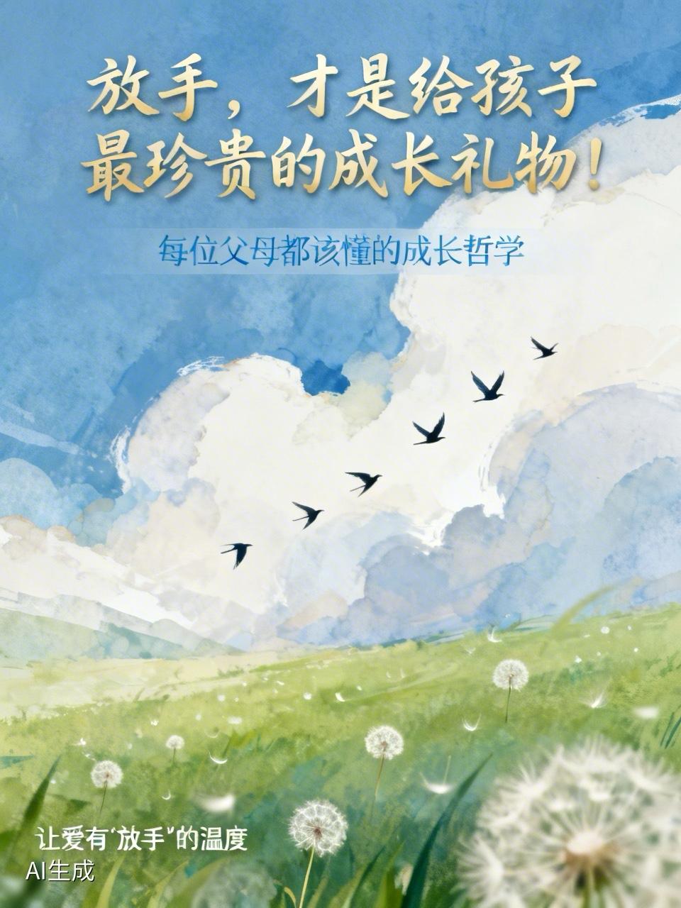 放手,才是给孩子最珍贵的成长礼物!每位父母都该懂的“爱的智慧” 作为父母,谁不把孩子当成心头的宝贝?从孩子呱呱坠地的那一刻起,我们的心就紧紧牵挂着他们。每天忙前忙后,操心他们的吃穿住行,生怕孩子受一点委屈,走一点弯路。可有时候,我们的爱,真的会不会“太多”了? 生活从来不是一条平坦的大道,而是布满坎坷和挑战的旅程。孩子如果从来不摔跟头,不碰壁,怎么会真正明白生活的艰辛和不易?就像我们小时候,调皮捣蛋,撞得头破血流,才懂得疼痛的意义,才知道什么该做,什么不该做。 孩子的成长,必须靠他们自己去经历,去摸索。我们给了他们生命,这是一份天大的缘分,但人生的路,终究得他们自己去走。我们可以陪伴他们走一段,遮风挡雨,却无法代替他们走完整个旅程。 人生如画,孩子就是画家。无论画得怎样,都是他们独一无二的作品,值得骄傲。可有些父母总怕孩子犯错,一见孩子要做“傻事”,就急忙阻止,唠叨不休。其实,这样的“保护”,有时反而会成为孩子成长的绊脚石。 孩子如同小树苗,不经历风雨,怎能长成参天大树?让他们犯错、跌倒,才能学会反思和坚强。正是在这些经历中,他们才会慢慢成长,变得更加自信和独立。 我有个朋友,小时候特别爱爬树掏鸟窝。起初,他的父母担心他会摔伤,常常阻止他。但后来,他们选择放手,只在旁边提醒注意安全。一次意外摔下树,膝盖流血,他哭得撕心裂肺,但从那以后,他学会了如何判断树是否安全,如何更稳妥地爬树。现在,他感激父母当初的“狠心”,因为那让他学会了独立和勇敢。 父母的放手,不是冷漠,而是深沉的爱。我们不能永远握紧孩子的手,而是要给他们自由成长的空间。让他们在跌倒中学会站起,在挫折中积累经验,在挑战中锻炼意志。 就像蝴蝶破茧而出,只有经历挣扎,才能拥有美丽的翅膀,自由飞翔。孩子终有一天会离开我们,去追求自己的梦想,过自己的生活。我们无法替他们解决所有问题,但可以成为他们坚强的后盾。 所以,从现在开始,放手吧!放手让孩子去闯,去试,去成长。给他们一个宽广的天空,让他们用自己的翅膀,飞得更高更远。 放手,是信任,是尊重,更是对孩子最深沉的爱。做孩子成长路上的观众,见证他们的欢笑与泪水。成功时为他们喝彩,失败时给他们温暖的拥抱,告诉他们:“没关系,爸爸妈妈永远支持你。” 只有这样,孩子才能在爱的滋养中茁壮成长,成为有担当、有勇气、有智慧的人生强者。 亲爱的父母们,别怕放手,那是孩子最好的成长礼物。让我们用爱,托起孩子飞翔的翅膀,迎接他们更加精彩的人生!你准备好放手了吗?欢迎留言分享你的故事,让我们一起为孩子的成长加油!叮嘱孩子六句话 家长放手智慧