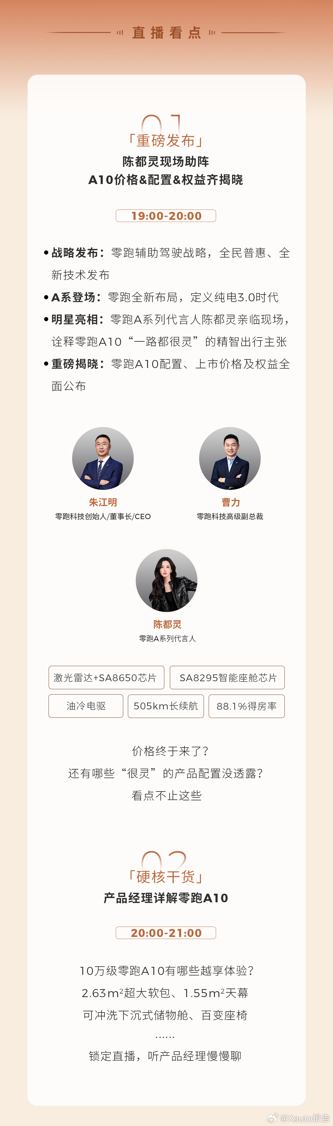 3月26日,零跑A10全球上市发布会将于3月26日19:00开启直播,百大媒体联合放送。该车定位智能精品长续航SUV,零跑A系列代言人将亲临现场助阵,发布会上将正式公布车型价格、配置及上市权益,感兴趣可预约观看直播。零跑A10陈都灵代言零跑A103月26日零跑A10上市零跑汽车新能源汽车
