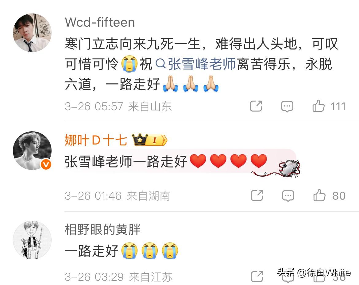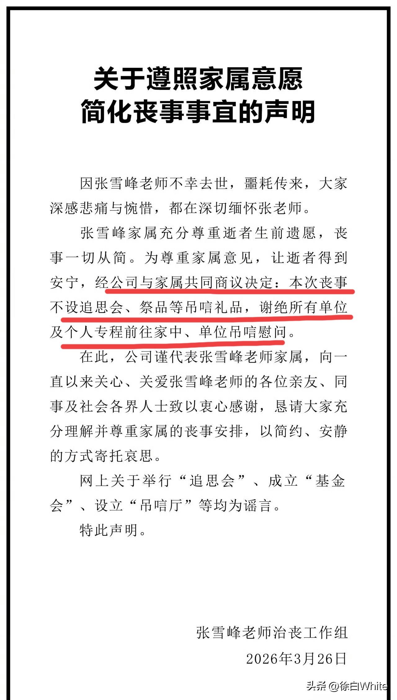 3月26日,张雪峰治丧工作组发布《关于遵照家属意愿简化丧事事宜的声明》 经过公司跟家属共同商议,张雪峰追悼会不设追思会,祭品等吊唁礼,谢绝所有单位及个人到公司或家里吊唁慰问! 向关心张雪峰及家属的各界人士表示感谢,也希望大家理解家属对张雪峰丧事的安排! 怎么说呢,逝者为大,一切以逝者遗愿及逝者家属意愿为主,看到声明,又看到源源不断送花的大家,以及一趟又一趟下楼搬花的张雪峰公司同事们,大家都在以自己力所能及的方式悼念张雪峰,已足以……