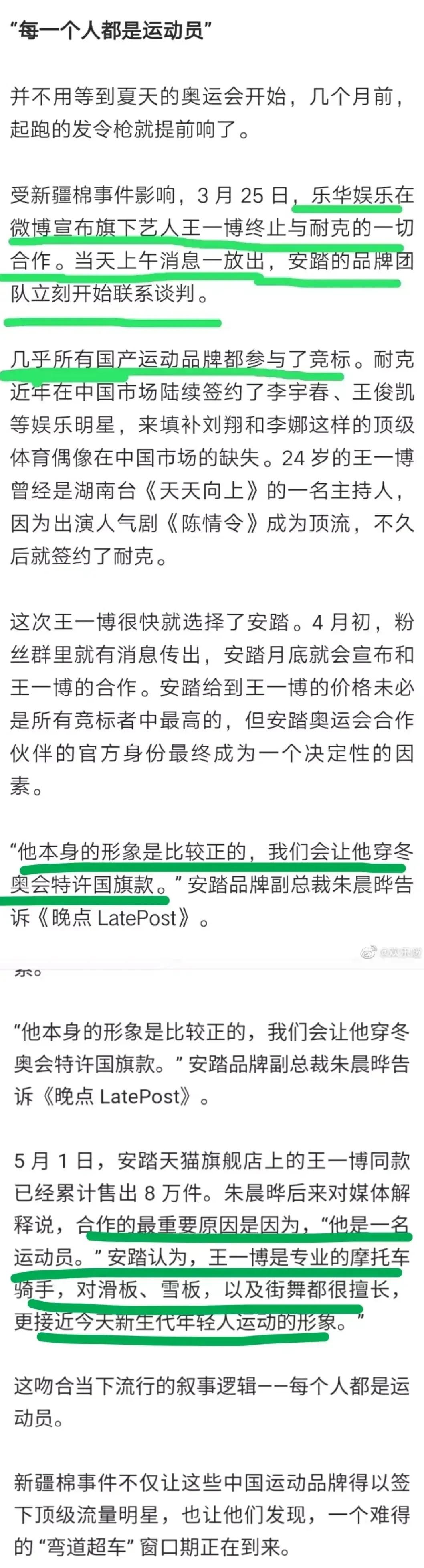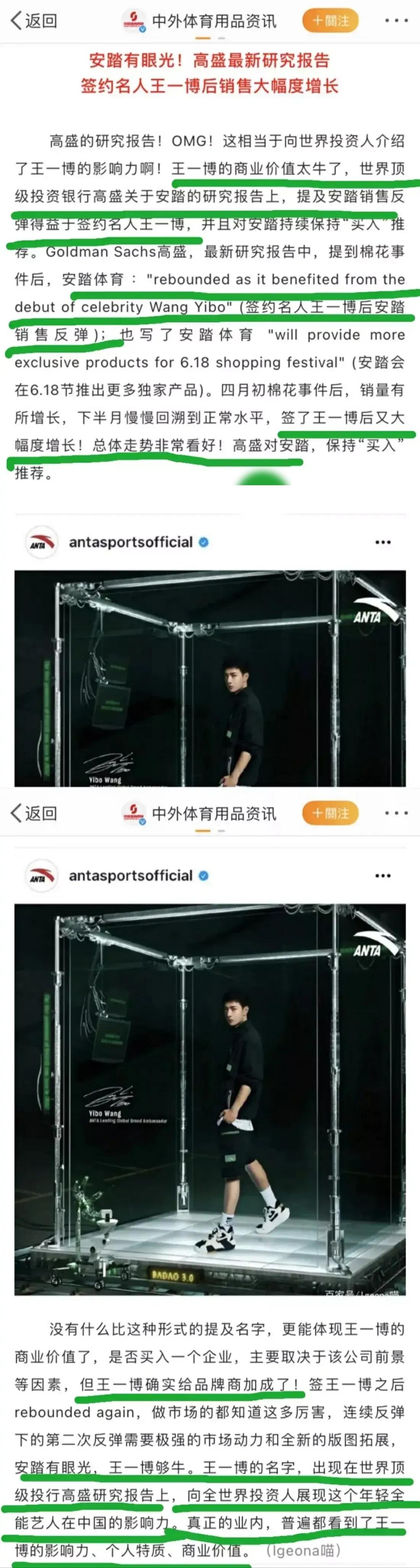 安踏2025年财报新鲜出炉:业绩创新高,营收破800亿,表现高于市场预期!进一步拉大了领先地位。 不得不说,全球首席代言人选得好,就是毫无争议的小福星! 而王一博也是目前为止,唯一的一个“安踏品牌全球首席代言人”的title所有者,没有之一。 21年新疆棉事件,3月5日王一博通过公司宣布与钩子解约,“当天上午消息一放出,安踏的品牌团队立刻开始联系谈判”,4月29日便正式官宣并给与前所未有的“全球首席代言人”的title。 而21年开始,也是安踏全球瞩目下开始突飞猛进的一年,此后,更是节节攀升。 家国大义之前,爱国青年王一博雷霆万钧当断则断的决绝,和安踏“志在必得”果断的千里奔赴,成就了之后彼此一次又一次的辉煌,也成就了今天更潮更酷业绩遥遥领先的安踏。