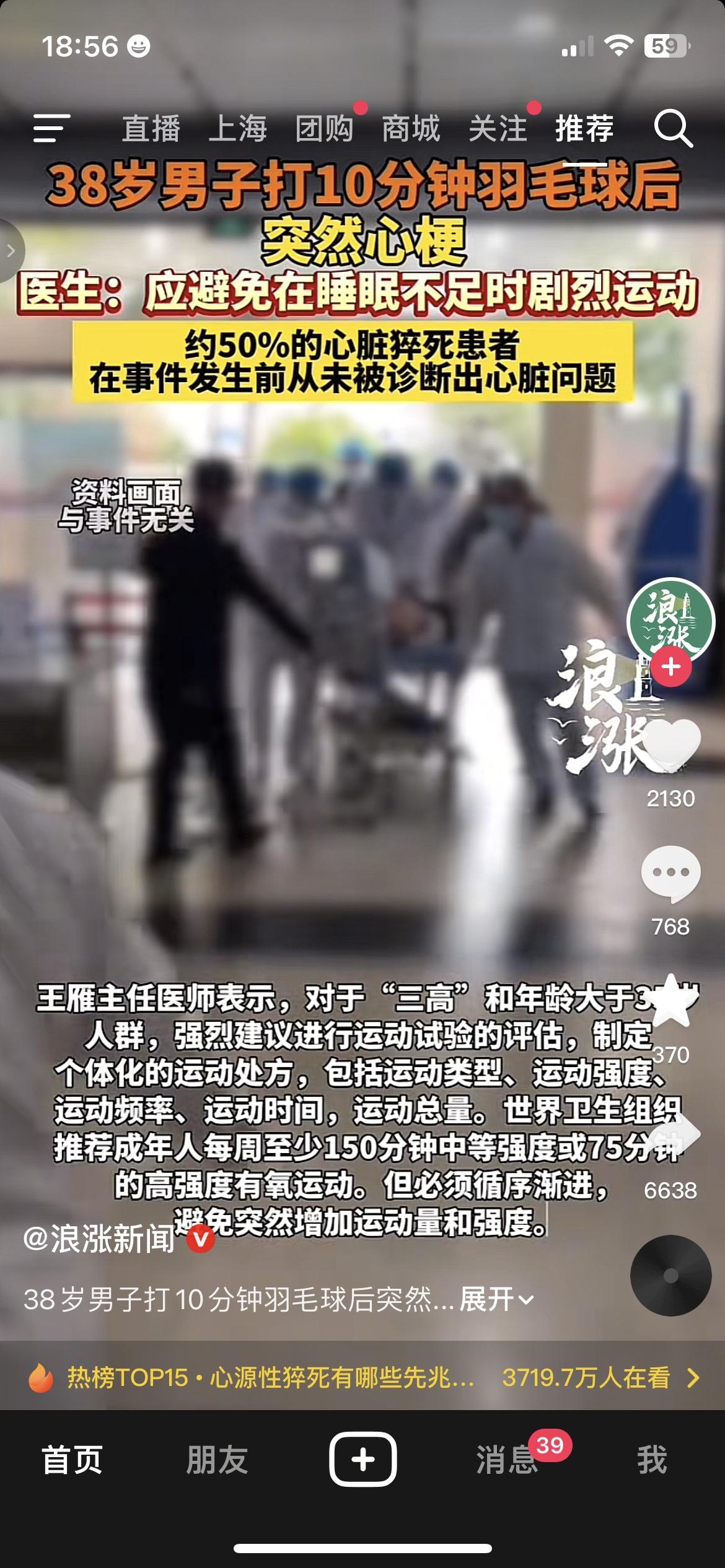 38岁男子打10分钟羽毛球后心梗!医生警告:别在睡眠不足时剧烈运动 看完真的揪心,运动健康真的不能大意!😭 38岁男子,只打了10分钟羽毛球,就突然心梗,差点没救回来。医生说,核心原因就是睡眠不足还强行剧烈运动,诱发了意外。 更吓人的是,约50%的心脏猝死患者,事发前从未被查出心脏问题,看似健康的身体,可能早就埋下隐患! 医生强烈提醒:“三高”人群和35岁以上的人,先做运动评估,定个性化运动方案;普通人运动一定要循序渐进,别突然加量,熬夜、睡眠不足的时候,千万别硬扛着运动! 健康从来不是小事,别等出事才后悔。 你平时运动前会注意身体状态吗?评论区提醒身边人! 心梗 运动健康 心脏猝死 健康警示