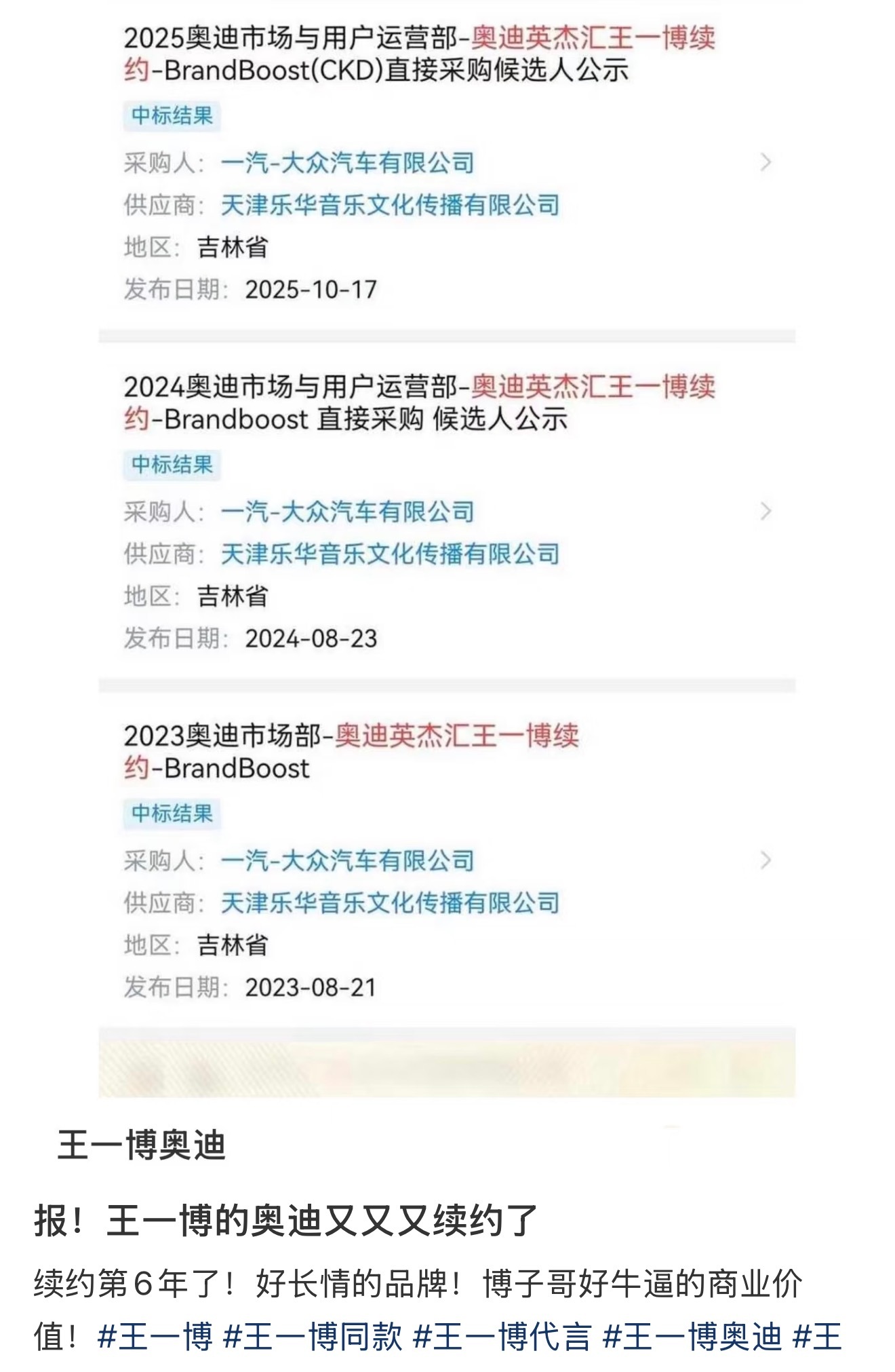 王一博和奥迪续约第六年了,首日官宣直接晒单6千辆,后续还因为奥迪晒单过于豪气了接