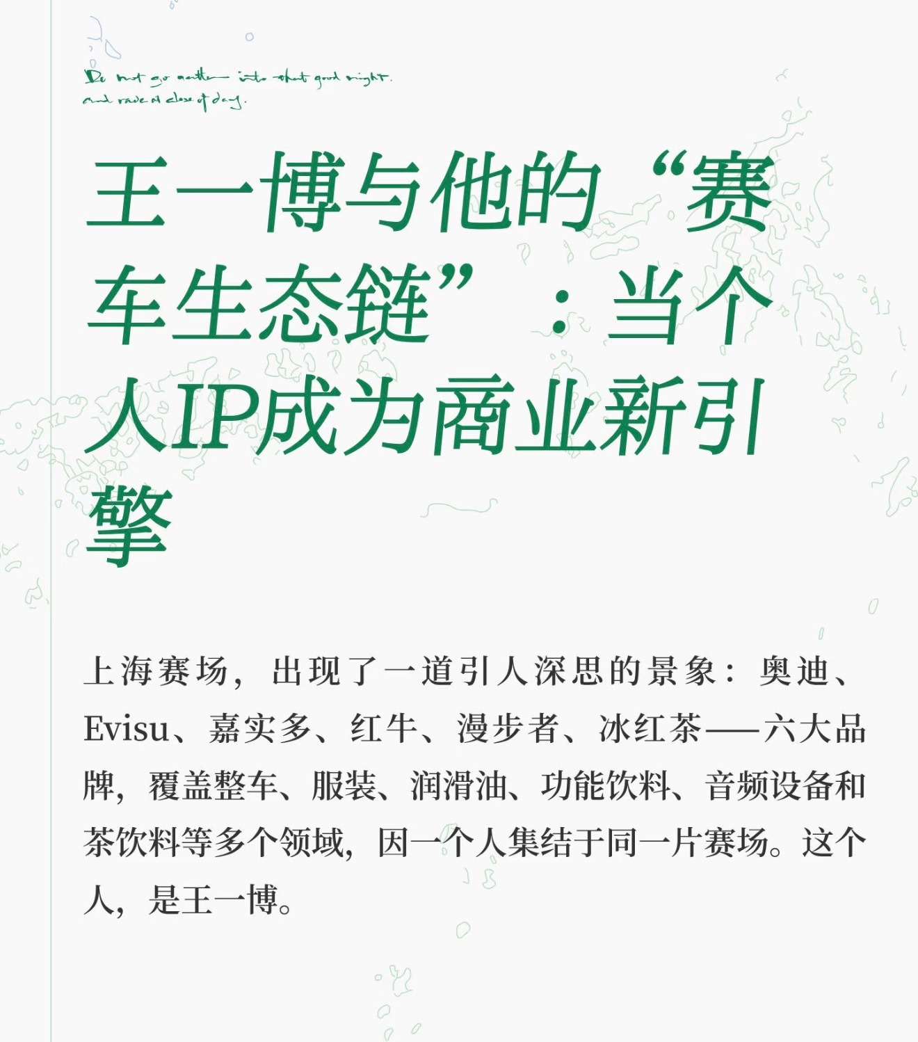 王一博和奥迪续约第六年了,首日官宣直接晒单6千辆,后续还因为奥迪晒单过于豪气了接了嘉实多机油代言,之后接触了赛车圈子还引发了一些赛车生态链……天选之子啊就这样旺品牌