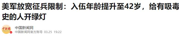美国要打大仗了! 3月25日,据美国五角大楼发布的消息称,美国将在4月20日开始,正式将入伍的最高年龄从35岁提高到42岁,那些因为“毒品”而被定罪的人,也不再需要特殊许可就可以入伍了,多位专家表示,美国这是准备为实施战争动员做准备。 以前美国招兵的标准其实挺严的,别说有毒品定罪记录的人,就算是体重超标、有文身,都可能被拒之门外。 而且入伍年龄一直卡得很死,35岁就是上限,超过一点都不行。可现在为什么突然放宽这么多?其实核心原因就一个,美国招不到足够的兵了,也就是咱们常说的“兵源荒”。 根据美国媒体之前的报道,现在美国17到24岁的年轻人里,至少有70%因为肥胖、心理健康问题、吸毒史、犯罪记录或者没上过高中,不符合以前的入伍标准。 更关键的是,愿意参军的年轻人越来越少,适龄青年里愿意加入陆军的比例只有0.4%,少得可怜。 美军每年需要招募超过15万名新兵,才能补上退役和减员的空缺,可近几年一直招不够,就连海军都因为兵源短缺,停运了17艘支援舰艇,可见情况有多严重。 可能有人会说,招不到兵就放宽标准,这不很正常吗?其实不然,这次的调整幅度太大,根本不是普通的补充兵源。 大家想想,42岁的人,体能和反应速度肯定比不上年轻人,以前根本不会纳入招兵范围,现在却主动放宽年龄,就是想尽可能多招一些人,扩大兵源储备。 而放开对毒品定罪人员的限制,更是反常,以前这种有案底的人,想当兵连特殊许可都难申请,现在直接放开,说明美国已经急到不计较兵员质量,先把人招进来再说。 多位军事专家都分析过,这种大规模放宽招兵标准的做法,只有在战争动员的时候才会出现。因为一旦要打大仗,需要大量的兵力,不管是年轻人还是年纪大一点的,只要能当兵、能参与作战相关工作,就都要争取过来。 而且美国最近的军事动作也能印证这一点,就在这个招兵政策发布前没多久,美国已经开始向中东地区增派地面部队,还把最先进的F-22战斗机部署到了以色列,这是美国第一次在以色列部署作战飞机,目的就是为了应对和伊朗的潜在对抗。 还有消息显示,美国军方一直在考虑夺取伊朗的浓缩铀、攻占伊朗的哈尔克岛,这些都是需要大量兵力才能完成的作战任务,也能看出美国确实在为大规模战争做准备。 以前美国招兵,还会注重兵员的素质,担心有吸毒史的人会影响部队纪律,担心年纪大的人跟不上训练节奏,但现在已经顾不上这些了,只要能招到人,先填满兵源缺口,为打大仗做好准备,其他的风险只能暂时放在一边。 其实美国的“兵源荒”也不是一天两天了,这几年一直在持续恶化。一方面是年轻人不愿意参军,觉得当兵又苦又危险,待遇也不算好,还容易遭遇战场伤亡;另一方面是美国年轻人的整体素质在下降,肥胖、吸毒、心理健康问题越来越普遍,符合招兵标准的人越来越少。 为了缓解这个问题,美国之前就已经放宽过一些标准,比如缩短新兵训练时间、取消部分大麻检测,这次更是直接放宽年龄和毒品定罪限制,一步步突破底线。 专家们还说,美国这次调整招兵政策,本质上就是战争动员的前期准备。战争动员就是要在短时间内扩大兵力,做好作战准备,而放宽招兵标准,就是最直接、最快速的方式。毕竟一旦真的打起来,兵力就是基础,没有足够的兵,再先进的武器也没用。 美国现在这么做,就是在提前储备兵力,应对可能发生的大规模战争,尤其是在中东地区,美国和伊朗的矛盾越来越突出,双方的对抗也在不断升级,美国这是在为可能的冲突做准备。 按照目前的情况来说,就算他们招到了足够的兵,也未必能打胜仗。毕竟放宽标准招进来的兵,素质参差不齐,有吸毒史的人可能会出现精神不稳定的情况,年纪大的兵体能也跟不上,这些都会影响部队的战斗力。 而且历史上也能看出来,美国每次高调开战,往往都很难体面收场,不管是越南战争、阿富汗战争,还是伊拉克战争,美国都付出了巨大的代价,最后深陷战争泥潭。 总的来说,美国这次调整招兵政策,绝对不是偶然,也不是简单的补充兵源,而是明确的战争动员准备。从提高入伍年龄,到放开毒品定罪人员的入伍限制,再到近期的军事部署,每一步都在为打大仗做铺垫。 我们能做的,就是做好自己的事,坚守和平底线,同时时刻保持警惕,做好应对各种突发情况的准备,只要我们自身足够强大,就不用害怕任何挑衅。
