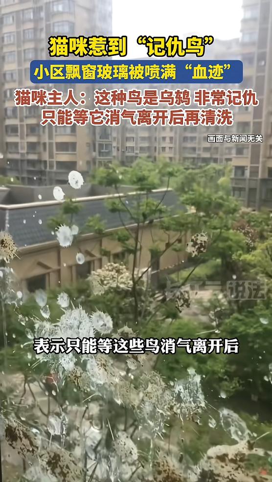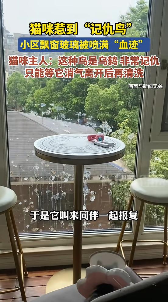 “哭笑不得”!近日,浙江宁波,一女子在家时,发现玻璃上出现一道道酷似血迹的痕迹,拍视频时,恰好拍到一只鸟和自家猫咪对峙的画面,女子查询后,才知道这种鸟叫乌鸫,十分记仇,可能是自家猫咪招惹到它,于是叫来同伴一起报复!网友:这难办了! 最近浙江宁波一位张女士的遭遇,刷爆了社交平台,说出来让人哭笑不得,又有点无奈,家住小区10层的她,前段时间在家没事,突然发现次卧飘窗玻璃上,多了一道道酷似血迹的痕迹,看着还挺吓人。 张女士一开始也懵了,自家住这么高,谁会没事往玻璃上弄这些东西?她赶紧拿出手机拍视频,想留个证据,结果拍着拍着,恰好拍到一只黑鸟和自家猫咪在窗边对峙的画面,一人一猫一鸟,场面特别有意思。 拍完好视频,张女士就赶紧查询这只鸟的来历,用AI软件查了之后才知道,这种鸟叫乌鸫,最出名的就是记仇,报复心特别强。 结合自家猫咪平时总爱趴在窗边往外瞅的样子,张女士大概猜明白了,估计是自家猫咪之前招惹到这只乌鸫了,人家记仇,就叫来同伴一起“报仇”。 说白了,玻璃上那些像血迹的东西,根本不是什么血迹,全是乌鸫的鸟屎。张女士说,现在飘窗玻璃上密密麻麻全是,看着特别脏,可她也没办法,家住10层,总不能冒着危险自己去擦,只能等这几只乌鸫消气,再请清洁人员上门清洗。 其实这事也不是个例,后来了解到,乌鸫记仇报复的情况,之前也发生过不少。这种鸟看着不起眼,通体黑色,只有嘴是黄色的,和乌鸦有点像,但体型比乌鸦小,还能模仿上百种声音,俗称“百舌”。 可别被它的叫声迷惑,它的暴躁程度一点不低,只要感觉到被冒犯,就会记在心里,展开报复,张女士家的猫咪,大概率是隔着玻璃挑衅乌鸫,或者之前乌鸫靠近窗边时,猫咪扑过玻璃吓到它了。 毕竟乌鸫在每年农历3到5月是育雏期,这段时间护崽心切,脾气更暴躁,一点小冒犯,在它眼里都是大仇。 有网友看到这事,都调侃说“这难办了”,毕竟乌鸫报复起来没个准头,而且目前也没有太好的驱赶方法,总不能伤害它,也不能一直关着猫咪,之前还有人试过挂风筝,贴老鹰照片驱赶,结果都没成功,反而可能激怒乌鸫。 张女士现在也很无奈,一边是自家调皮的猫咪,一边是记仇的乌鸫,只能慢慢等育雏期结束,乌鸫举家离开,这事才能彻底解决。 其实仔细想想,这也是城市里人与野生动物相处的小插曲,乌鸫的报复,说到底也是本能的自我保护,只是刚好给张女士添了点小麻烦。 这事也给养宠物的朋友提了个醒,平时多看着点自家的猫和狗,别让它们随便招惹鸟类,尤其是乌鸫这种记仇的小家伙,不然真的会引来“连环报复”,到时候可就真的哭笑不得了。