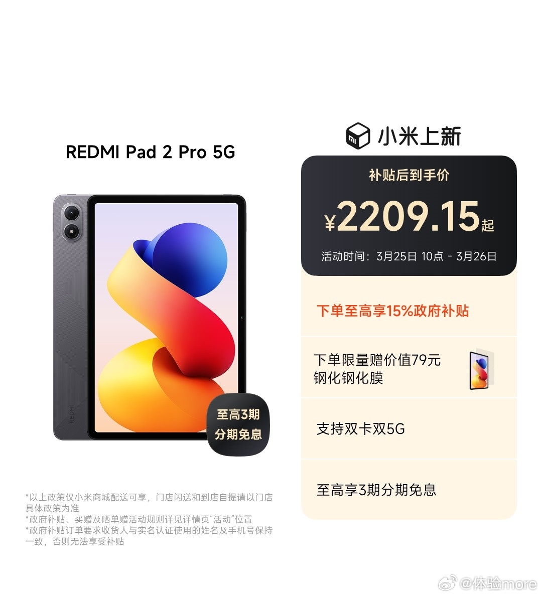 REDMI Pad 2 Pro 5G版开售,支持双卡双5G,也支持中国联通eSIM。