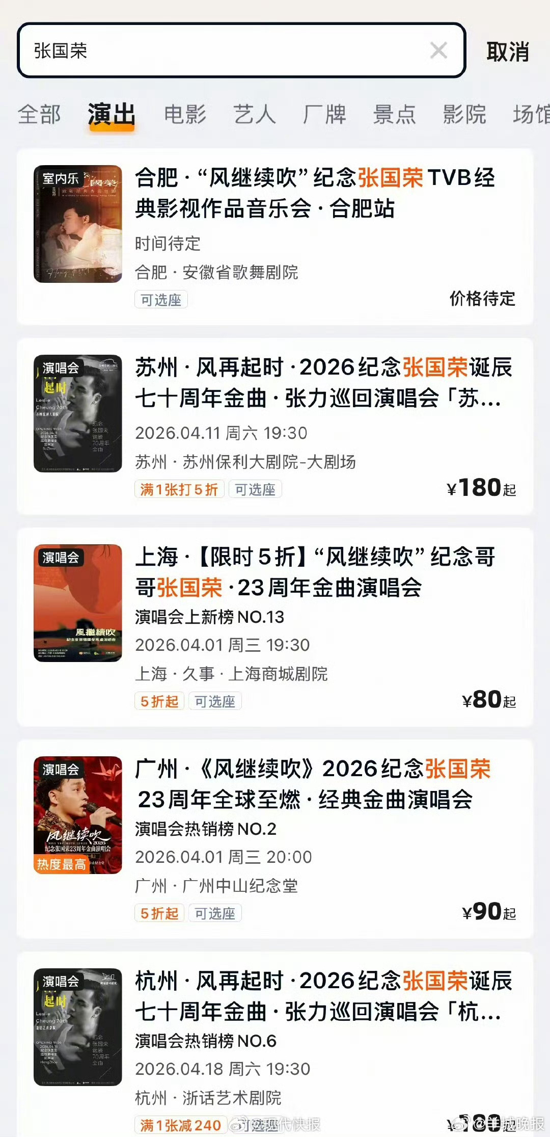 临近4月1日,记者查询各大票务平台发现,上海、广州、苏州、合肥等不少城市都即将相继举办以“纪念张国荣”为主题的金曲演唱会,演唱内容多为张国荣演唱的经典歌曲。