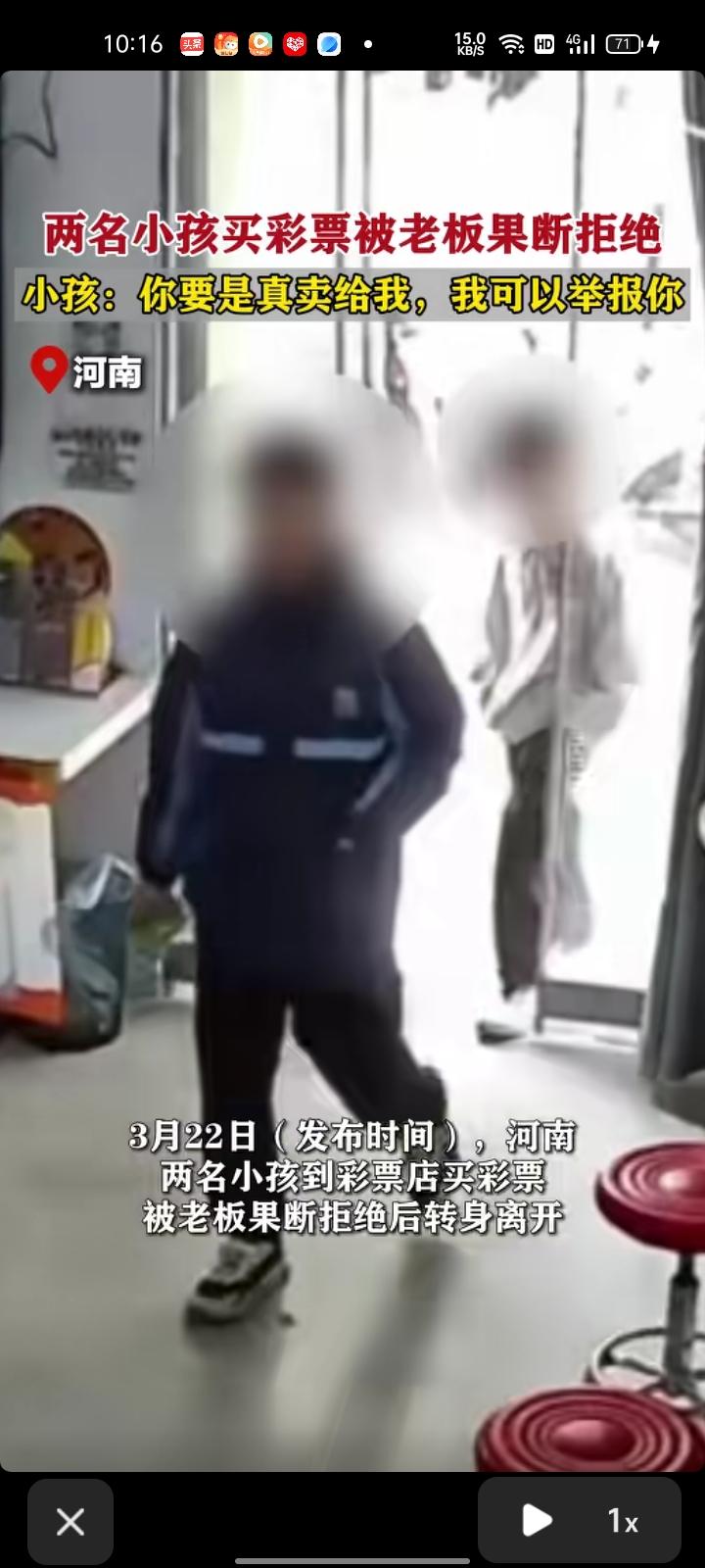 3月22日,河南郑州。监控画面显示,两小孩到彩票店买彩票,老板果断拒绝。几分钟后,小孩再次进店,说道:“老板,我们不是来买彩票的,要是给未成年人买彩票,我可以举报你,还能获得1000元奖金。” 老板这种行为遵守了守住了法律红线,《未成年人保护法》《彩票管理条例》明确规定不准给未成年人售卖彩票,如果给小孩卖彩票,搞不好小孩会有不劳而获快速赚大钱的想法。