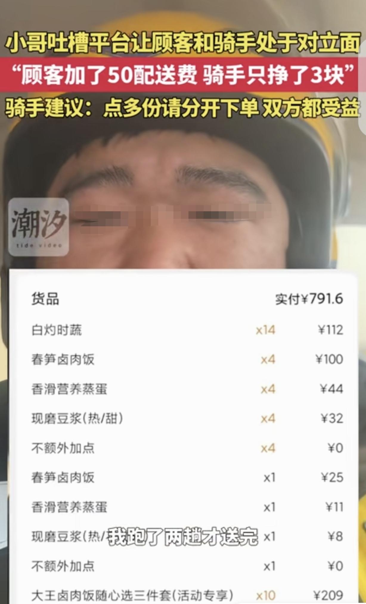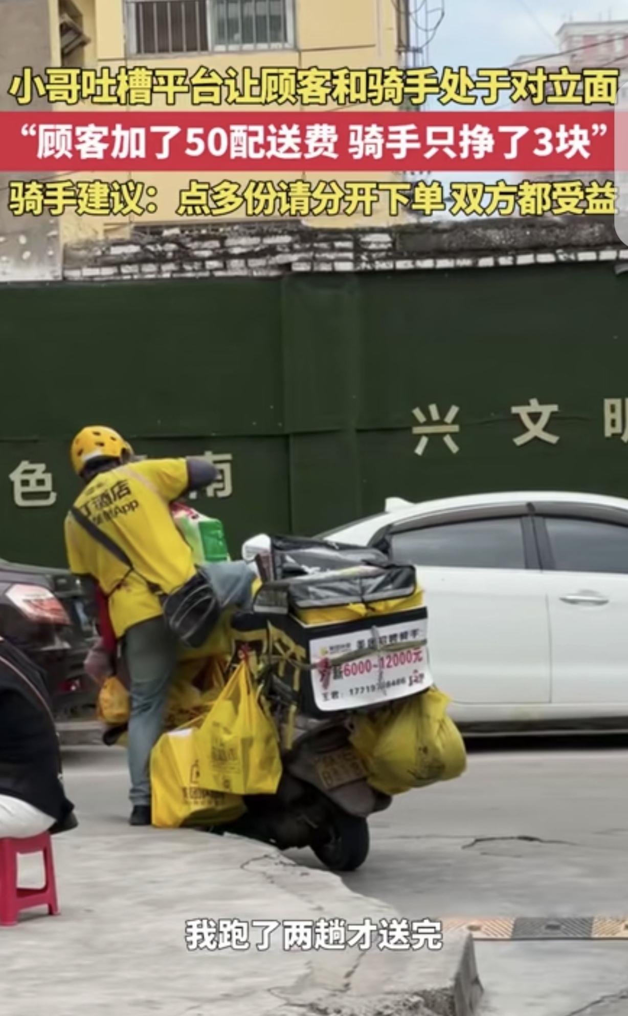 “挣钱没底线!”北京,一外卖小哥接了个700元的大单子,顾客特意加了50元配送费,可小哥却只挣了3块钱,还是跑2次才送完,就相当于一次挣1.5元,顾客不乐意了:我出了50元配送费,你咋态度这么差?小哥:你以为50元配送费,都进我口袋了吗?我就靠这高峰期挣钱呢,谁情绪能好?点多份外卖,请分开下单,双方都受益。 一男子是外卖小哥,每天骑着他的破电动车,穿梭在城市的大街小巷,给千家万户送去方便,也赚取收入养家糊口。 可最近发生的一件事,却让顾客和外卖小哥都憋了一肚子气。 那天正值中午用餐高峰期,一位顾客打算点几份外卖招待客人,她一下子点了700多的餐。 为了能尽快收到餐,她还额外加了 50 元配送费。 在顾客心里,这多花的 50 元,应该能让外卖小哥更积极、更高效地把餐送到自己手上。 很快,外卖小哥接到了这个订单。可当他看到订单详情时,心里就犯起了嘀咕。 原来,这个大单子包含了好几份餐,而且因为系统分配机制,他需要跑两趟才能送完。 更让他无奈的是,这看似丰厚的 50 元配送费,并不会全进他的口袋。 平台有平台的规则,扣除各种费用后,他跑完这两趟,实际上只能挣到 3 块钱,相当于跑一趟才挣 1.5 元。 高峰期本就是外卖小哥挣钱的关键时候,每一单的时间都十分宝贵。 为了多挣点钱养家糊口,小哥们都争分夺秒,恨不得一分钟掰成两分钟用。 可这个订单,不仅挣不到多少钱,还占用了他大量时间,让他没办法接更多高收益的订单。 想到这些,外卖小哥的心情自然好不起来,送餐时的态度也就没那么热情了。 顾客等着外卖,结果等来的却是态度不好,黑着脸的外卖小哥。 他心里那个憋屈啊,自己花了 50 多元的配送费,不就是图个方便、图个舒心吗?可现在钱花了,服务却没跟上,这让他实在难以接受。 其实,外卖小哥心里也明白顾客的不满。 他觉得自己和顾客都没错,顾客想快点收到餐,自己也想多挣点钱,只是这配送费的分配方式,让他们都不舒服。 经过这件事,外卖小哥也总结出了经验,他建议大家点多份外卖时,尽量分开下单。 分开下单后,每单的配送费相对独立,外卖小哥能更合理地安排送餐路线和时间,既能提高送餐效率,又能多挣些钱。 而顾客也能享受到更及时、更优质的服务,双方都能受益。 在生活中,很多看似不合理的现象背后,往往有着复杂的规则和机制。 当我们遇到问题时,不妨多站在对方的角度想一想,互相理解、互相包容,也许就能找到更好的解决办法,避免不必要的矛盾和冲突。 一语中的!平台的信息不对称才是骑手和顾客矛盾的根源,一边藏起真实配送状况,一边让顾客误解骑手效率,把本该互相体谅的两方推到对立面。骑手挣的是辛苦钱,顾客付的是服务费,真正该反思的,是躲在背后的平台方,别让信息差寒了骑手心、伤了顾客情! 《民法典》第509条规定,当事人应遵循诚信原则,全面履行义务,秉持诚实,恪守承诺。 外卖平台隐藏配送费分配规则,导致顾客误以为骑手可获全额配送费。 骑手因真实收益过低情绪受影响,引发双方冲突,本质是平台未履行信息披露义务,违背诚信原则。 如果平台明确公开配送费拆分明细,引导顾客合理下单,即可避免这类矛盾。 对此,你怎么看?