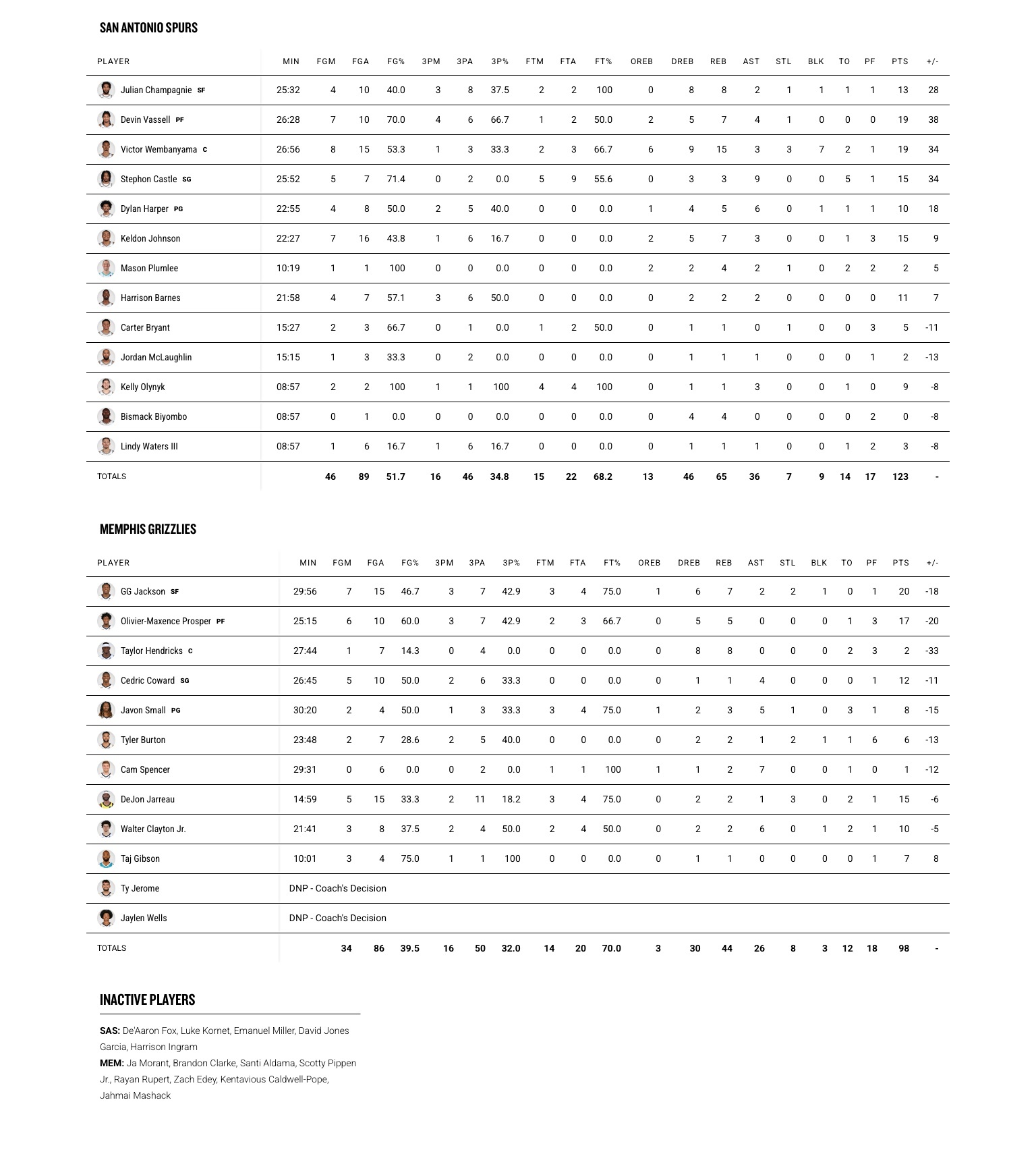 马刺(55-18):文班亚马19分15板3助3断7帽、瓦塞尔19分7板4助、凯尔登15分7板3助、卡斯尔15分3板9助、尚帕尼13分8板2助、巴恩斯11分2板2助、哈珀10分5板6助、奥利尼克9分1板3助、布莱恩特5分1板、沃特斯3分1板1助、普拉姆利2分4板2助、麦克劳林2分1板1助、比永博4板