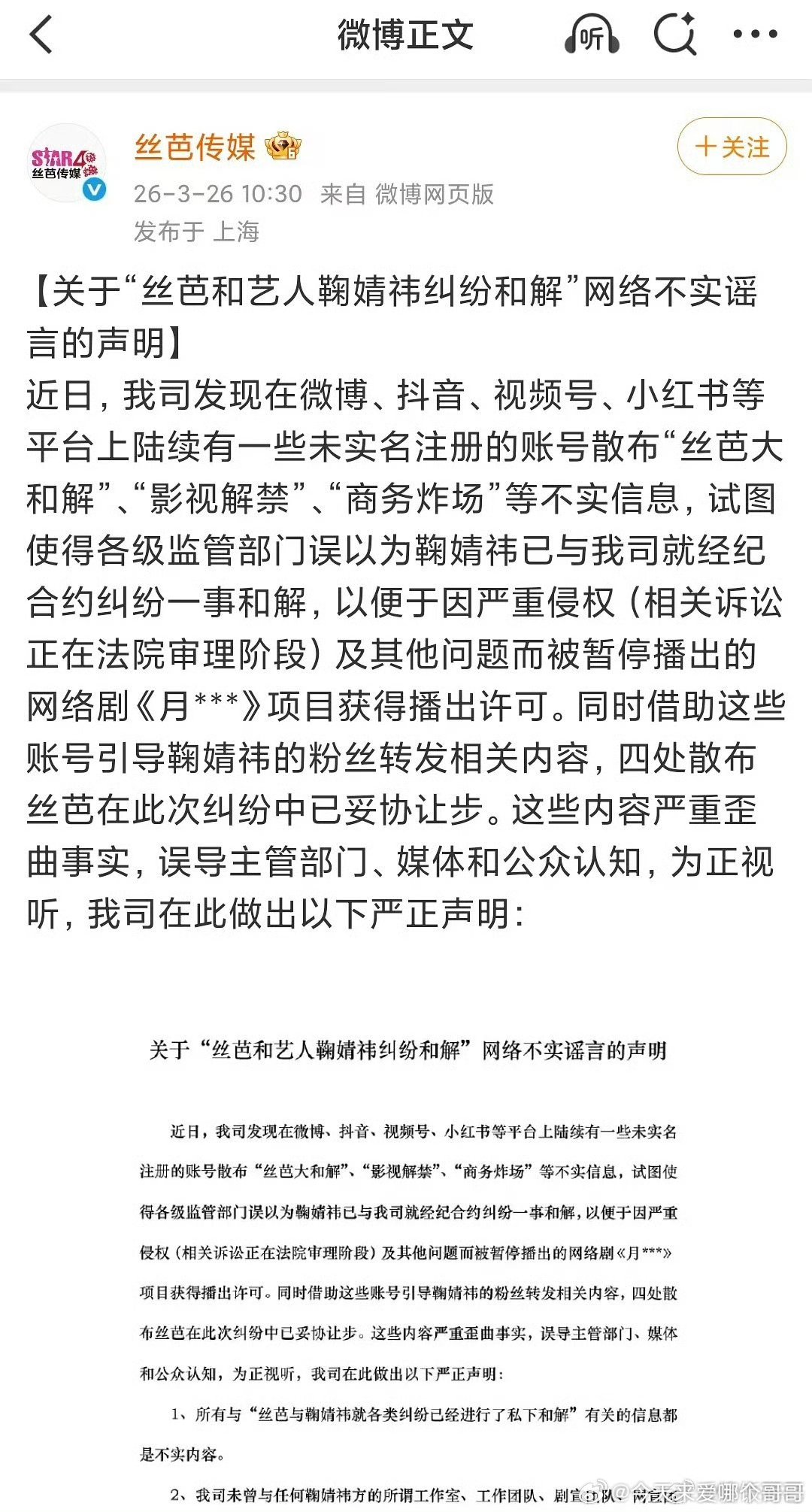 丝芭辟谣网传和鞠婧祎和解:合约纠纷还在司法审理阶段,未达成任何和解 ,《月鳞绮记