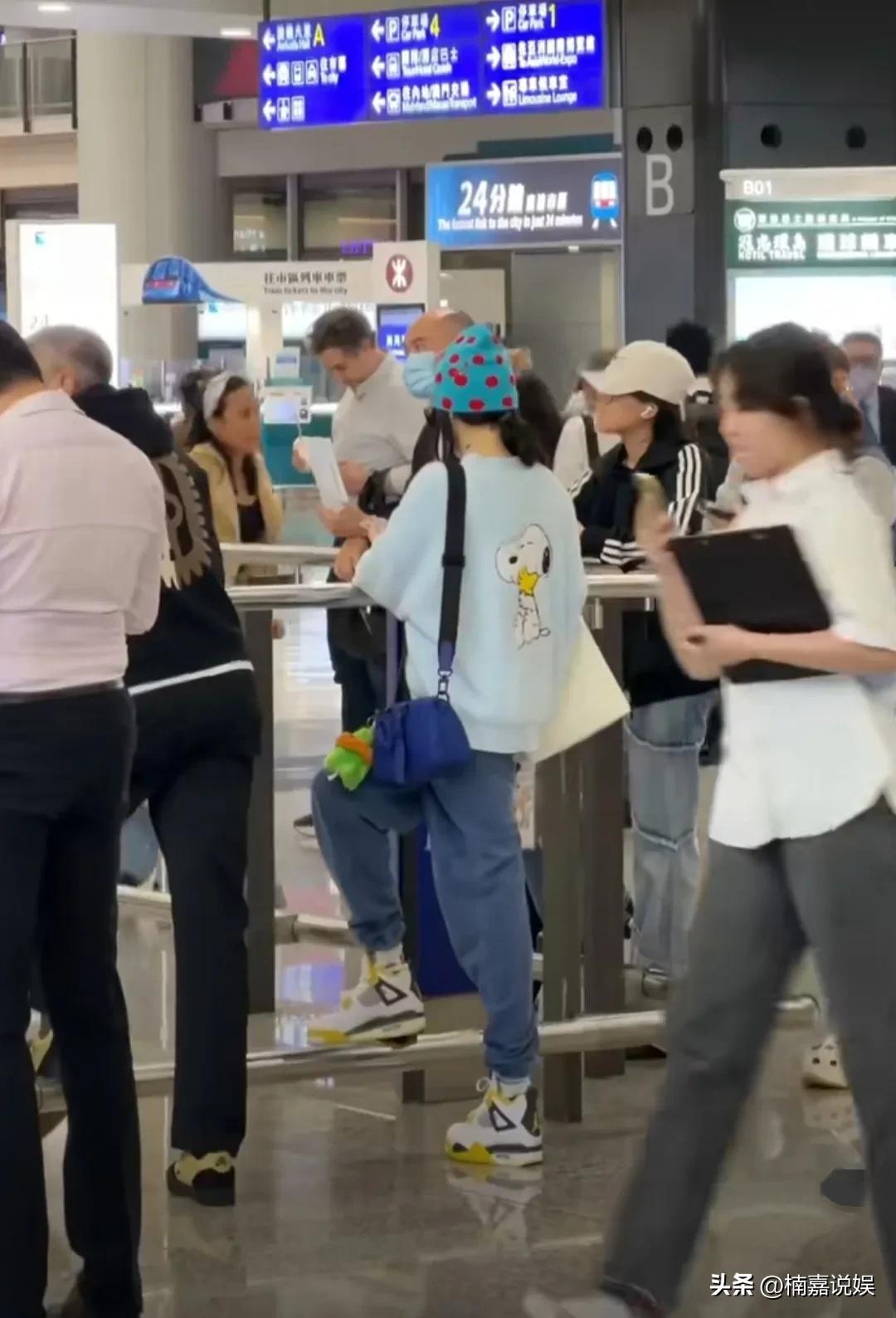 她穿着蓝色卫衣配束脚裤,还戴着一顶有草莓图案的蓝色帽子,身材纤瘦,穿搭很有少女心,背影看着好年轻。