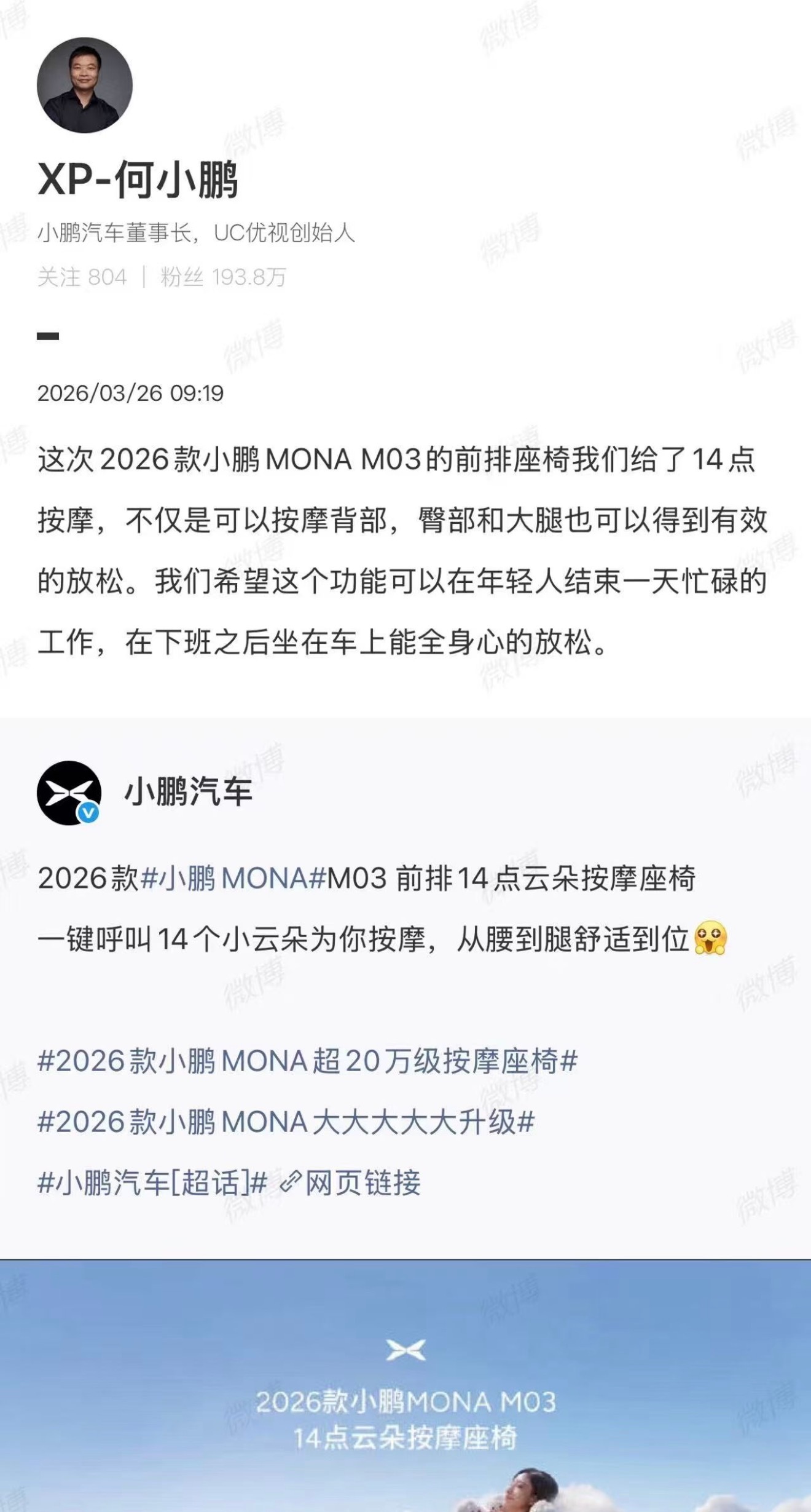 新款小鹏MONA M03升级点太多了,50W风冷快充、双层镀银全景天幕、后门氛围灯、运动加热方向盘、前排14点云朵按摩座椅,真正实现20万级越级舒适体验。2026款小鹏MONA超20万级按摩座椅2026款小鹏MONA大大大大大升级