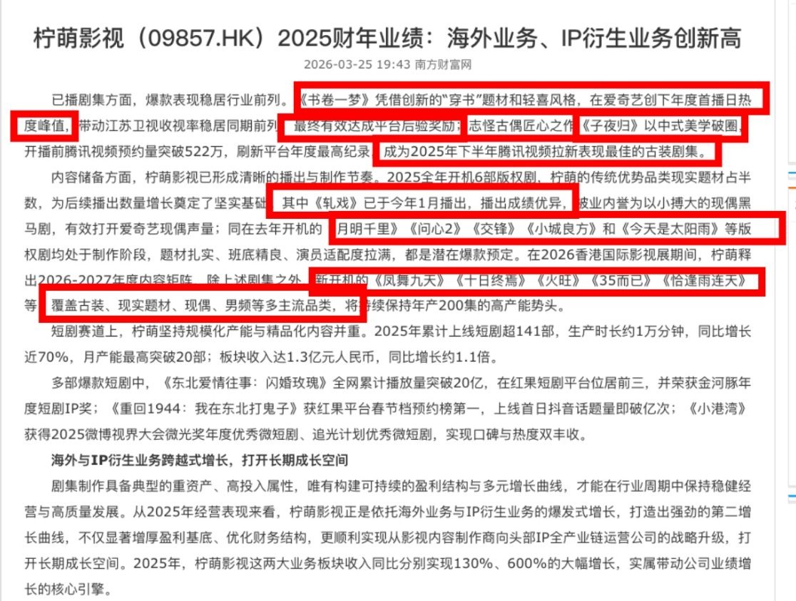 柠萌影视2025年开机量最高 柠萌2025年财报8.6亿营收,6部新剧200多集,行业寒冬里还能盈利,确实有点东西明年《十日终焉》《火旺》排队开机,感觉可以蹲下。柠萌2025年财报盈利
