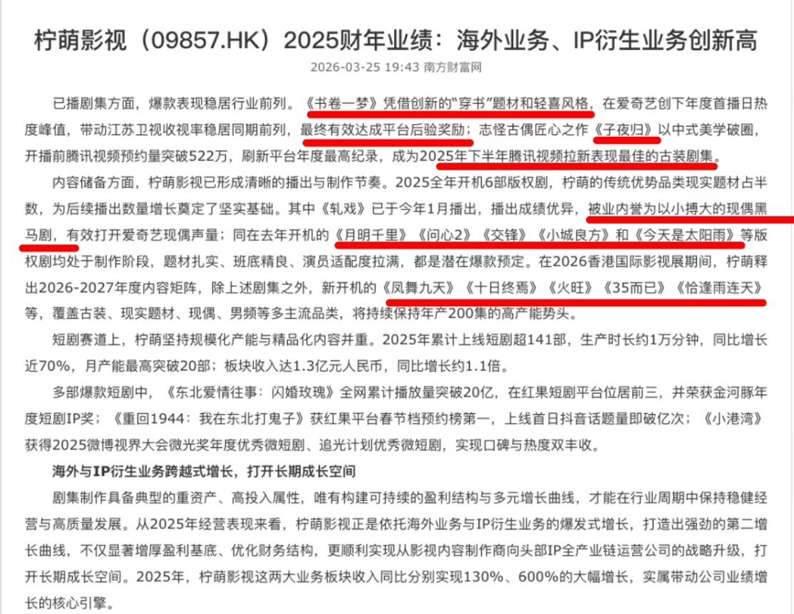 柠萌影视2025年开机量最高 柠萌2025年财报8.6亿营收,6部新剧200多