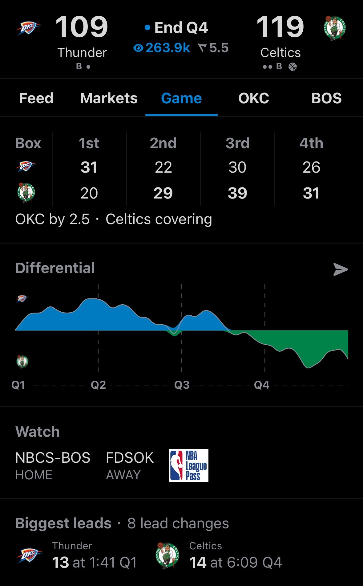 雷霆109-119不敌凯尔特人。 亚历山大33分8助攻,多尔特14分5篮板。布朗31分8篮板8助攻;塔特姆19分12篮板7助攻雷霆vs凯尔特人