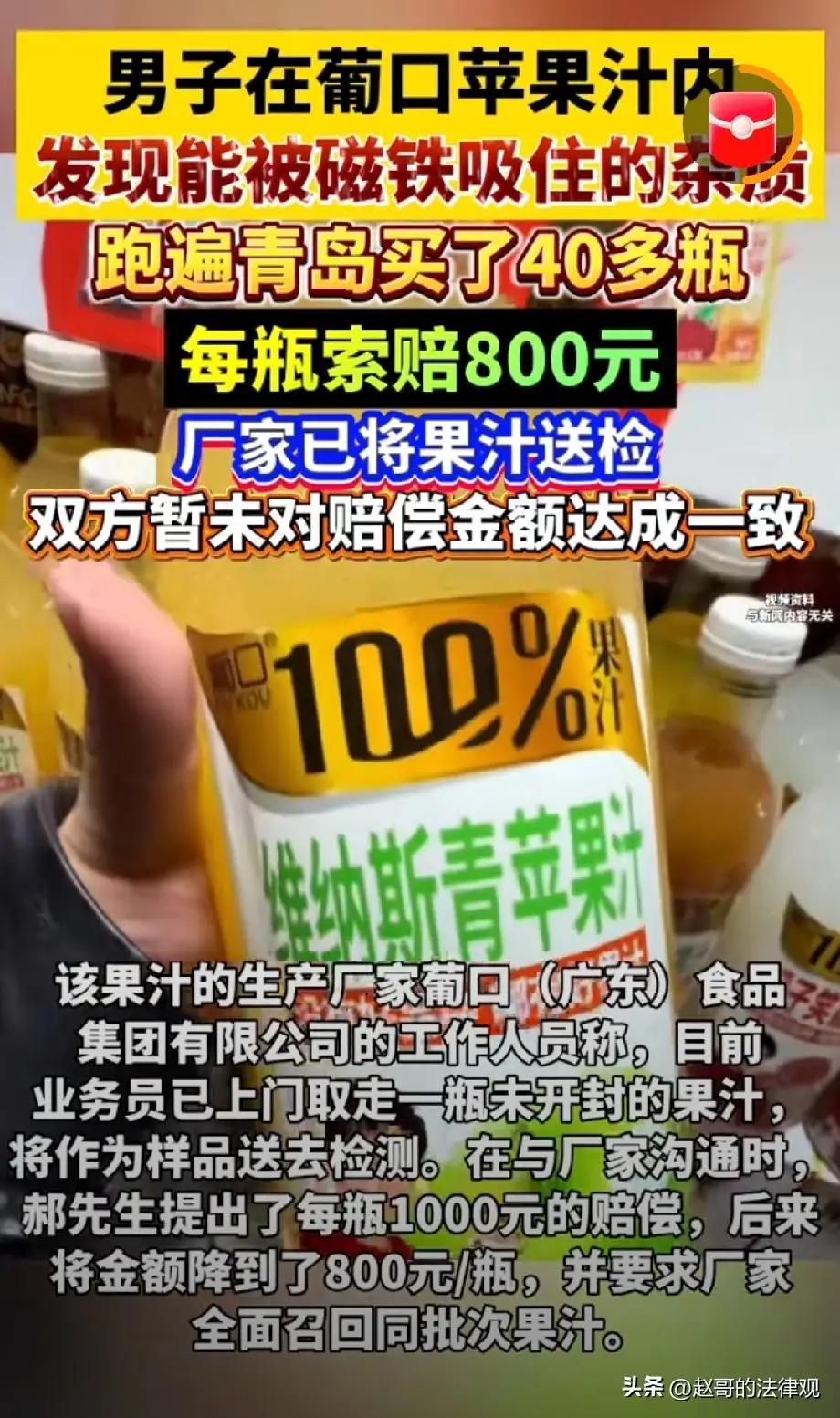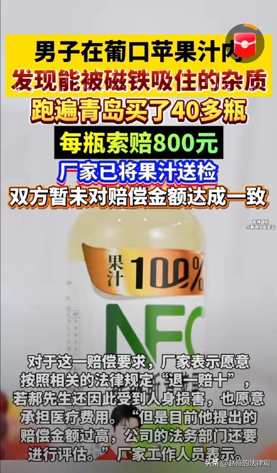 40瓶果汁里的较真:维权是面镜子,照见责任与初心 今儿咱们单说一桩发生在青岛街头的“果汁奇案”。这事儿,听着像“鸡蛋里挑骨头”,实则是一场关乎“舌尖安全”的正义之战。山东青岛的郝先生,花十几块钱买了瓶葡口青苹果汁,谁曾想打开一看,果汁浑浊不堪,瓶底竟沉着些能反光的“小黑点”,拿磁铁一吸,嘿,还隔着瓶子“隔空传情”!这哪是喝果汁?分明是“喝铁屑”,让人一阵反胃。 想当年,咱们遇到这种糟心事,往往“自认倒霉”,顶多扔了瓶子换家店。可郝先生偏不,他一股脑跑遍大半个青岛,买了40多瓶同批次果汁,瓶瓶都有“铁屑”相伴。这操作,堪称“教科书式维权”!面对厂家“退一赔十”的“小恩小惠”,郝先生不为所动,张口就是每瓶800元赔偿,还要厂家全面召回。厂家觉得他“狮子大开口”,可郝先生心里清楚:食品安全无小事,这“铁屑”要是进了肚子,可不是“退一赔十”能解决的! 但这“较真”的背后,藏着的正是咱们今天要说的“大健康”智慧。真正的健康,讲究“内外双调”。外在,咱们得学会“依法维权”,别让那“将就”的心态成了健康的“隐患”,吃得放心才是“硬道理”;内在,这“感恩之心”更是不可或缺。我们要感恩这“法治的阳光”,是它让“一颗老鼠屎坏了一锅汤”的乱象得到整治;更要感恩这“敢于较真的勇气”,它让我们明白,每一次理性的维权,都是在为更安全的市场环境“添砖加瓦”。这种“维权有道”的通透,才是滋养身心的“灵丹妙药”。 我们要感恩这“舌尖的安全”,它虽看似微小,却让每一个平凡的日子都充满了安心的味道。 愿世间少一些“差不多”的敷衍,多一些“零容忍”的严谨。 愿你我皆安康,前程皆似锦! 果汁营养陷阱