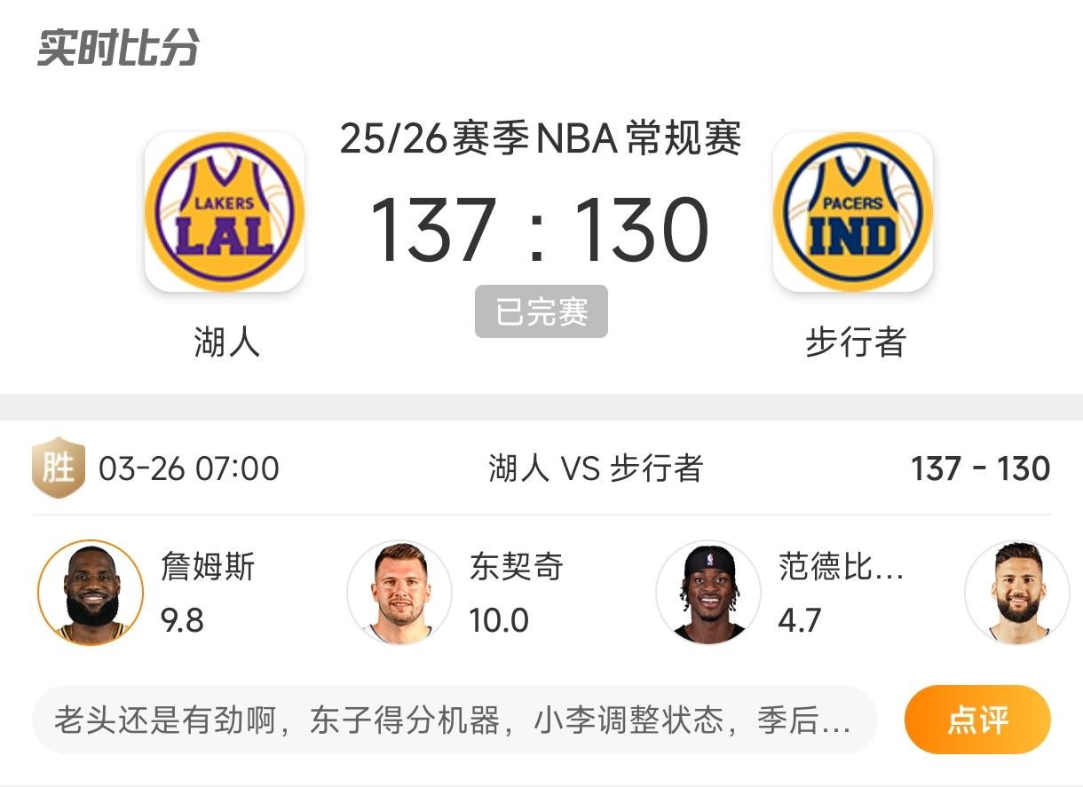 41岁詹姆斯仍能暴扣!湖人双杀步行者。 2026年3月26日,NBA常规赛,湖人客场137-130力克步行者,完成本赛季对对手的双杀。 这场球,赢得真不轻松。 步行者主场向来难缠,两队从开场就咬得死紧,比分来回交替,全程没拉开过安全差距。 真正主导比赛走势的,是东契奇。 他全场爆砍43分,三分突破样样在线,招招打在步行者的软肋上,关键时刻的连续得分,直接帮湖人稳住了阵脚。 而最让人看得心头一热的,还是詹姆斯的表现。 今年已经41岁的他,全场拿下准三双,还献上了多次干净利落的暴扣,每一次起跳,都在狠狠打那些唱衰者的脸。 多少人从几年前就念叨,詹姆斯该退役了,说他跑不动了,跳不起来了,只能靠经验混日子。 可他偏不。 只要站在场上,他就拼满每一分钟,既能串联全队给队友喂饼,也能在需要的时候,用一记暴扣点燃全队的士气。 这场双杀,对湖人太关键了。 常规赛收官阶段,每一场胜利都直接关系到季后赛排位,东契奇的稳定输出,加上老詹的兜底,这支湖人的底气,越来越足。 别总拿年龄说事,对詹姆斯来说,年龄从来都只是个数字。 只要他还站在场上,就没人敢轻视这支湖人。