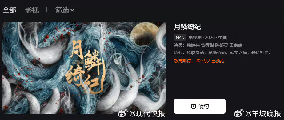 #月鳞绮纪预约量超200万#【#鞠婧祎陈都灵新剧预约量超200万#】截至2026年3月26日,古装奇幻剧《月鳞绮纪》在平台的预约量已正式突破200万。该剧由、、、(排名不分先后)领衔主演,特别推荐主演,、、、、、、主演。、特邀主演。据悉,该剧改编自经典 IP《画皮》,讲述九尾狐露芜衣从懵懂小妖蜕变为复仇女神的成长故事。戳更多>>#曝月鳞绮纪又撤档了##汪苏泷明日世界演唱会官宣##偶遇谢娜夜骑给张杰送花##张凌赫登了贴吧##四代高会##葛晓倩怒怼留几手#(现代快报)(编辑:张子皓;审签:谢杨柳)