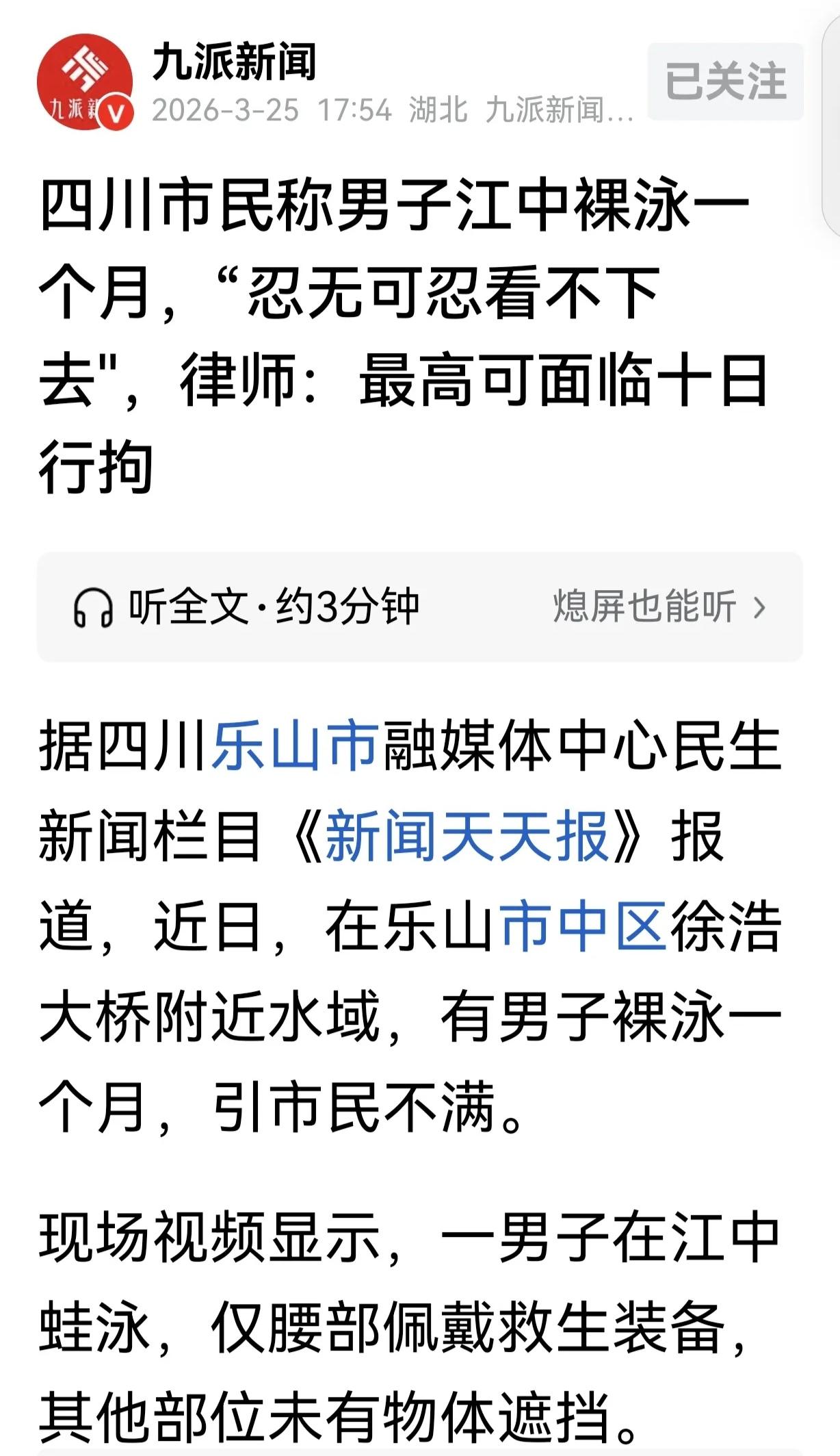 “有礼的街道,无礼的河道?”四川乐山一男子大白天裸泳一个月,路人直呼辣眼睛 公共河道里,到底能不能想脱就脱? 最近,四川乐山某大桥附近出了件让路人“不忍直视”的事儿。 大白天的,江面上有个四五十岁的男子在游泳。游泳本身没毛病,关键是他除了腰上拴了个救生浮球,浑身上下啥也没穿。 更让人无语的是,这还不是偶尔一次。附近居民说,这大哥已经在江里裸泳快一个月了,而且专挑白天人多的时候。 大桥附近本来就是大家散步、锻炼的地方,人来人往,谁路过往水里扫一眼,都能看见这尴尬的一幕。有位女市民实在是看不下去了,拍下视频求助,觉得这种行为太不尊重人。 用她的话说,这简直是逼着过路的人“洗眼睛”。大人尴尬也就算了,万一放学路过的孩子看到了,这算怎么回事? 一、河道不是自家浴缸,想怎么游就怎么游? 这事儿传到网上,网友们的评论也挺有意思。 有人觉得,河道又不是私人游泳池,起码的体面得有。也有人调侃说,这是“有礼的街道遇上了没礼的河道”,不穿衣服也不违和,觉得辣眼睛别看呀。 但调侃归调侃,大家心里都有一杆秤:公共场所不是私人领地,不能想怎么脱就怎么脱。你的“穿衣自由”或者“脱衣自由”,不能建立在恶心别人的基础上。 二、法律怎么管?不是“法不责众”就能随便来 虽然咱们的法律条文里没专门写“不准裸泳”这四个字,但在公共场所故意裸露身体,这本身就踩了《治安管理处罚法》的红线。 律师分析得很直白:江河湖泊只要是大家都能自由出入的地方,就属于公共空间。在这儿光着身子,不仅是违背公序良俗,更是实打实的违法行为。 《治安管理处罚法》第52条规定得很清楚:在公共场所故意裸露身体隐私部位的,处警告或五百元以下罚款;情节恶劣的,处五日以上十日以下拘留。 像这种持续了一个月、专门挑白天人流密集区“放飞自我”的情况,一旦被认定为“情节恶劣”,可不是口头教育就能了事的。轻一点的可能被警察警告或者罚点款,要是闹得民愤太大、劝都不听,最高能关上十天。 三、裸泳到底算不算个事儿? 有人说,裸泳也叫事儿啊?成百上千人,根本管不了,大概也是法不责众吧。 这个想法其实挺危险的。法律管不管,关键看两点:一是是不是“公共场所”,二是是不是“故意”。某大桥附近属于公共休闲区域,人来人往,这大哥连续一个月白天裸泳,故意在人流密集处暴露身体,已经对他人视觉造成了强制干扰。 当地派出所已经关注到了这个情况,准备去现场核实。其实解决这事儿也不难,只要路人发现后及时报警,警察出面制止是名正言顺的。 说到底,江水再清凉,也洗不掉这种行为给公共文明抹的黑。不知道这位大哥是出于什么心理——是想自我解压呢,还是想出名呢,还是觉得自己很有魅力?但他可能忘了一点:无形中已经触犯了法律。 最后说两句 有句话说得在理:你的自由止于别人的鼻子。在公共场合,每个人都得为自己的行为负责。 你觉得在河里裸泳算不算个事儿?河道算不算公共场所?欢迎在评论区聊聊你的看法。 来源: 综合自四川乐山当地居民反映及媒体报道