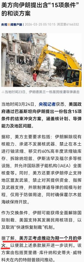 特朗普真敢想!提议和伊朗先停战30天 3月24日,根据央视新闻报道,美国政府通过巴基斯坦向伊朗提交了一项15项的谈判合同,提议双方停战30天,如果伊朗同意的话,可以获得解除国际制裁,和取消快速恢复制裁机制,该方案目前由特朗普女婿和中东特使进行推进 3月25日的贝特谢梅什,随着一声巨响,Sejjil-2导弹以惊人的16倍音速撕裂了夜空,精准地把耶路撒冷郊外那个至关重要的卫星接收站,连同它承载的一整套军事神经系统,瞬间变成了废墟。 以色列那边虽然第一时间一口咬定这是“民用设施”,但明眼人都知道,这纯粹是嘴硬,这可是以色列70%以上军用卫星数据的中转站啊!现在它没了,以军那些平时吹得神乎其神的精确制导武器,误差直接从几米飙升到了几十米。 欧洲的卫星工程师也给出了评估:想要修复,哪怕是加班加点,最少也得45天。 在这场瞬息万变的战争里,45天,简直就是一个世纪那么漫长。 真正让人看清局势走向的,倒不是那枚导弹本身,而是华盛顿随后的一个小动作,3月23日,美国悄悄通过巴基斯坦向伊朗递了一份文件,里面洋洋洒洒列了15个条款,核心意思就是让伊朗停火30天、弃核、拆设施、限制导弹发展、停止支持代理武装,作为交换条件呢?美国说会“考虑”解除部分制裁。 注意啊,是“考虑”,而且还是“部分”。 这份文件的逻辑简直让人哭笑不得,就是想用一张随时可能变卦的空头支票,换走伊朗几十年积累下来的战略资产。 伊朗人又不傻,2015年那次伊核协议的教训还在眼前呢:签字、让步、销毁设施,最后等来的却是特朗普单方面撕毁协议,这种亏,吃一次就够了。 伊朗革命卫队前总司令礼萨伊说得很直白:想停火?先赔钱,先撤制裁,先给法律保证!47年的旧账,怎么可能靠一张30天的临时协议就一笔勾销? 华盛顿为什么这么急?咱们算笔账就明白了。 冲突才开始5天,美以联军光是发射“爱国者”拦截弹,就烧掉了24亿美元,你想想,一枚萨德拦截弹就要1200万美元,而伊朗那边一架沙赫德无人机才多少钱?顶多也就2万到5万美元,这哪里是战争,简直就是一场单方面的烧钱游戏。 现在的情况是,美以的弹药库快见底了,补给一时半会儿又跟不上,从韩国紧急调来的萨德系统,面对伊朗那种铺天盖地的饱和攻击,就像是用个破网兜去接子弹,根本防不住,整个预警体系摇摇欲坠,而伊朗那边第79波攻势才刚刚结束。 与此同时,益普索3月24日的民调数据也给了特朗普当头一棒:支持率跌到了36%,执政以来的最低点。 61%的受访者反对扩大对伊军事行动,再加上油价飙升、通胀严重,老百姓的日子越过越紧,只有25%的人对生活成本表示满意,这个数字,比伊朗的导弹还要让人心惊肉跳。 所以说,那份所谓的“和平方案”,实际上就是一份“战术喘息申请”。 30天能干什么?足够美以联军修复被炸的基地,补充弹药,重新部署兵力,为下一轮打击做好准备。 伊朗人看得很透彻,军事顾问们的结论也很直接:现在答应停火,就等于把刀递给对方,让他们磨快了再来捅自己一刀。 3月24日伊朗国内那场抓了466人的大规模行动,逻辑也正在于此,这些被怀疑跟美以情报网有勾连的人,在战场之外构成了另一条隐形战线,只有先清除内部的隐患,才能确保对外抗争的决心不动摇。 伊朗总统佩泽希齐扬早在21日就对印度总理莫迪划下了道道:美以必须停止侵略,并且保证不再犯,才有资格谈结束战争,这个条件看似简单,其实是要对方给出一个结构性的承诺,不仅仅是停火,更像是一份认罪书。 现在特朗普的处境可以说是进退两难:既停不下来,也打不赢,国内选票和油价的双重压力逼着他必须找个台阶下,可他拿出的那份协议,每一条都像是在羞辱伊朗,让人家弃核自废武功,自己却不给任何安全保证,不道歉、不撤军,更别提对47年制裁的历史清算了。 伊朗武装部队发言人的表态那是相当硬气:打到彻底胜利为止!没有废话,也没有商量的余地。 Sejjil-2导弹从发射到命中只需要15到30分钟,末端还能变轨机动,现有的反导系统根本追不上 当伊朗手里还握着这样的王牌,而美以的拦截弹已经见底的时候,所谓的“停火换空间”逻辑,就彻底失去了存在的土壤。 有些和平,是真的为了和平;有些停火,不过是为了下一场更残酷的战争做准备罢了。 对此你怎么看? 信源:央视新闻客户端