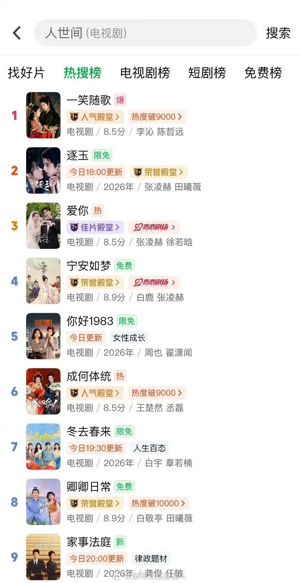 陈哲远一笑随歌登顶了站内电视剧和热搜榜单,力压一众在播剧包括逐玉,就这样躺赢了