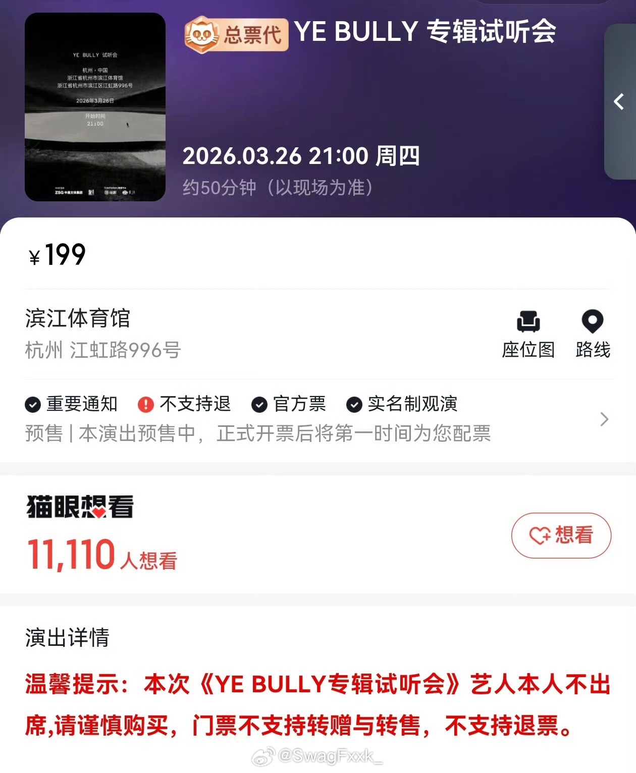 今晚Ye新专辑还会在杭州体育馆举办试听会,不过Ye不会到场!