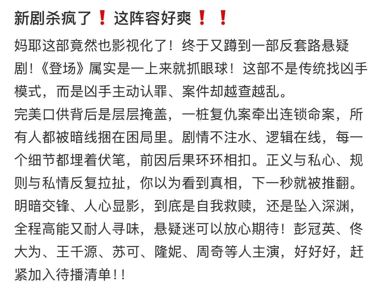 网剧登场杀青网剧登场50天拍摄圆满落幕!彭冠英、佟大为、王千源「警医匪」集结,这悬疑剧配置直接封神!三位东北狠人同框飙戏,不敢想象会有多爽!剧情也是扑朔迷离,凶手自首还敢给警方下DDL,全员藏秘密,无人能全身而退,优酷快播!