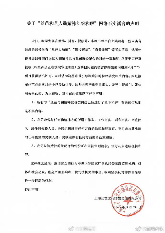 【#郭敬明为月鳞绮纪出品方之一#】据报道,近日,由主演的网传古装奇幻剧《月鳞绮纪》开播时间引发争议。3月26日,丝芭传媒发布声明称:其未曾与任何方进行任何方面的治谈和解事宜,所有与“丝芭与鞠婧祎就各类纠纷已经进行了私下和解”有关的信息都是不实内容。#丝芭称未与鞠婧祎方和解#天眼查App显示,《月鳞绮纪》出品方之一上海最世文化发展有限公司成立于2010年3月,法定代表人为郭敬明,注册资本500万人民币,经营范围包括广播电视节目制作、发行等,由郭敬明全资持股。更多>>#葛晓倩怒怼留几手##白鹿留洋大小姐造型##曝月鳞绮纪又撤档了##奔跑吧路透##丝芭否认与鞠婧祎和解##四代高会#(封面新闻)(编辑:张子皓;审签:谢杨柳)