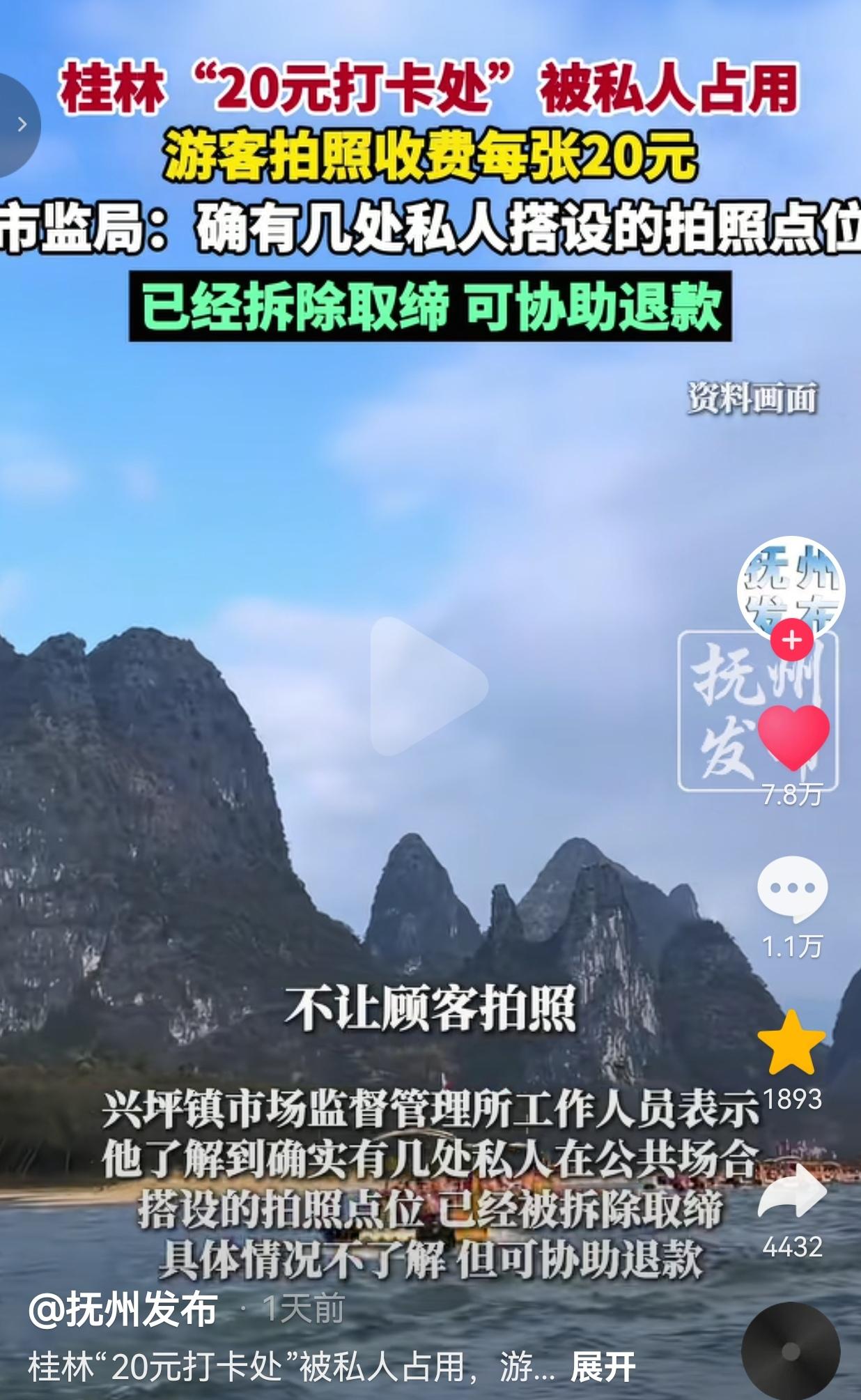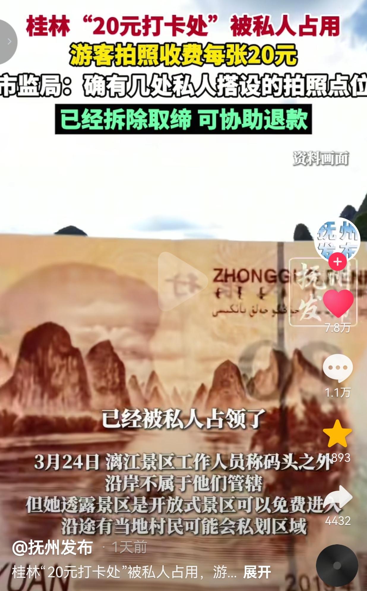 脸都不要了!桂林20元打卡点被私占,拍张照要20块,不给就赶人? 3月24日,广西桂林阳朔,那个印在20元人民币上的网红打卡点,居然被一群当地人给“圈”起来了! 游客想拍张同款风景照?行,掏20块钱!不然就别想站那块刻着“20元背景”的石头,甚至会被人凶神恶煞地赶开,连手机举起来都要被骂。 有游客爆料,这帮人直接在公共区域搭起了拍照点位,把最佳机位死死占住,自己拿着相机蹲守,游客想免费拍?门都没有!态度横得不行,嘴里骂骂咧咧,就差把“此路是我开”写在脸上了。 更讽刺的是,漓江景区工作人员还甩锅说“码头之外不归我们管”,合着公共风景,就成了某些人坐地起价的摇钱树? 好在市监局终于出手了:确认有几处私人拍照点位,已经全部拆除取缔,还能协助游客退款! 网友看到后评论说:“丢死人了!我们桂林山水是给全国人看的,不是给这帮蛀虫薅羊毛的!赶紧把这些人赶出去,别毁了桂林的名声!” 也有的网友说:“我上周刚被收了40块!当时还以为是景区规定,现在想想真晦气!必须给我退款!” 还有的网友说:“见过宰客的,没见过这么不要脸的!公共风景凭什么收费?这跟拦路抢劫有啥区别?” 也有的网友说:“20块钱拍张照?我买瓶水喝不香吗?这帮人是穷疯了吧,把游客当冤大头宰!” 要我说,这根本不是“拍照收费”,是明目张胆的宰客! 什么叫“公共区域”?就是你我他,每一个中国人都能免费看、免费拍的地方!这帮人倒好,拿块石头、拉个绳子,就把祖宗留下的山水当成了自己的私产,把游客的钱包当成了提款机,吃相太难看了! 更让人生气的是,之前居然还有人甩锅“不归我们管”——公共风景没人守,游客权益没人护,这才是最让人心寒的! 桂林山水甲天下,甲的是风景,不是宰客的手段!再让这帮人折腾下去,谁还敢来桂林?谁还信“桂林山水甲天下”这句话? 最后,我想说的是:最美的风景,从来都不该被圈起来卖钱;最值钱的,永远是不宰客的良心! 对此,你怎么看? 信息来源:抚州发布