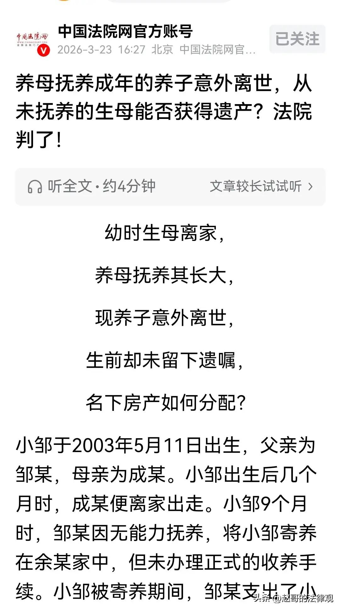 生而不养难享继承,情重于血终得善果 今儿咱们单说一桩发生在湖南株洲的“伦理大戏”。这事儿,听着像“农夫与蛇”的现实版,实则是一场关于“生恩与养恩”的正义裁决。女子生下儿子不久,便抛夫弃子,从此杳无音信,这哪是“十月怀胎”的深情?分明是“始乱终弃”的薄情。儿子9个月大时,被生父无奈送人,养母虽无血缘,却视如己出,含辛茹苦将他抚养成人。 想当年,咱们总觉得“血浓于水”,生母的恩情那是“天大”的。可现实呢?22岁的儿子意外身亡,养母悲痛欲绝,操办后事,尽了最后的“母子情分”。而这消失20多年的生母,听说留下一套房产,立马“闻风而动”,跳出来要分一杯羹。这哪是“认祖归宗”?分明是“见钱眼开”的贪婪!这吃相,未免太过难看,简直是给“母亲”二字抹黑。 但这“反转”的背后,藏着的正是咱们今天要说的“大健康”格局。真正的健康,讲究“内外双调”。外在,咱们得学会“敬畏规则”,别让那“侥幸心理”成了人生的“绊脚石”,法律的天平,永远是倾斜于公序良俗的;内在,这“感恩之心”更是不可或缺。我们要感恩这“养母的无私”,是她用爱填补了血缘的空缺;更要感恩这“法院的明断”,它让我们明白,权利与义务是对等的,没有付出,何来收获?这种“善恶有报”的通透,才是滋养社会肌体的“灵丹妙药”。 我们要感恩这“正义的降临”,它虽迟但到,让每一份真心的付出都得到了应有的尊重。 愿世间少一些“生而不养”的冷漠,多一些“大爱无疆”的温暖。 愿你我皆安康,前程皆似锦! 养恩胜于血缘