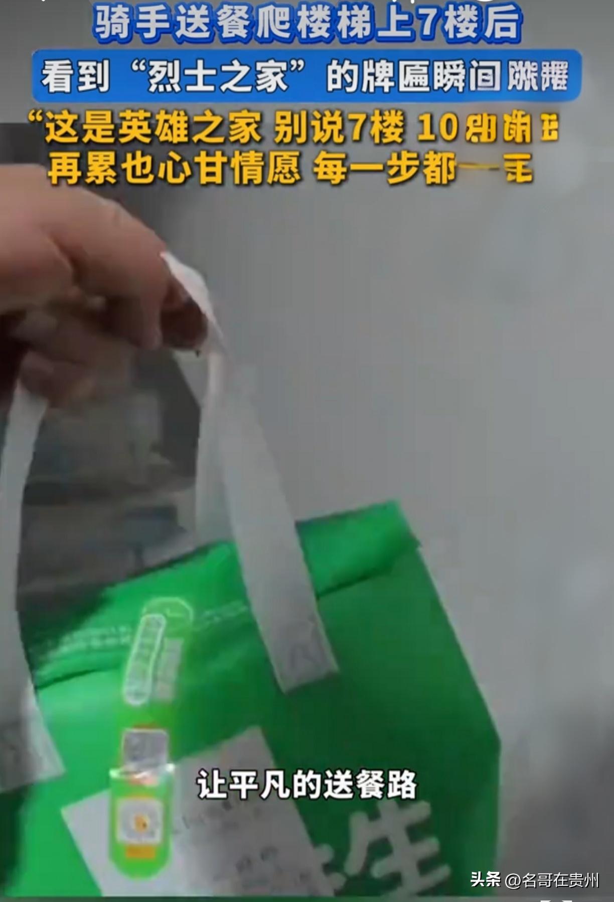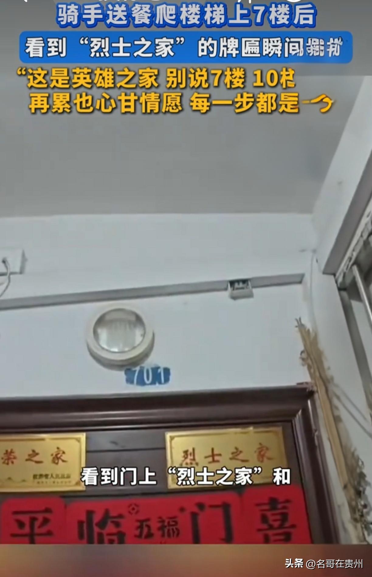 爬7楼累到想骂人!小哥抬头一看,一句话让全网泪崩! 跑外卖的,谁看见老小区无电梯的顶楼单,不得心里咯噔一下? 南京的外卖小哥小张,今天就接了这么一单。7楼,没电梯。他爬了足足5分钟,窄楼梯,陡台阶,工服后背全湿透了,腿肚子都打颤,心里那叫一个抱怨,就怕超时扣钱。 可当他喘着粗气,抬手准备敲门的那一瞬间,眼睛扫到门框上的东西,整个人愣住了。 门框上,挂着两块金灿灿的牌匾,一块写着“光荣之家”,另一块写着 “烈士之家”。 小张后来跟人说,他当时脑子嗡的一下,所有疲惫、抱怨,一下子全没了。他说自己活了20多年,见过“光荣之家”,但“烈士之家”是头一回见,就那么安静地挂在那儿,感觉沉甸甸的,他眼眶一下就热了。 他赶紧理了理自己汗湿的衣服,轻轻敲了敲门。开门的是位头发花白的老奶奶,很和善。小张双手把餐递过去,声音都变得特别恭敬:“奶奶,您的外卖,慢慢吃。” 送完餐,他没急着走。他跟老奶奶要了个手机号,说:“奶奶,我就在这附近跑单,以后家里有重东西要搬,或者有啥跑腿的活,您随时打我电话,我顺道就给您办了。” 这还不算完。小张回去之后,还在自己外卖骑手的群里,特意叮嘱了大家一句:“兄弟们,XX小区XX栋7楼那户,是烈士的父母,以后谁接到那的单,都上点心,别催单,别差评,能搭把手就搭把手。” 他说的那句话,后来被传到了网上,看哭了好多人。他说:“别说7楼,就是10楼、20楼,我都心甘情愿爬!” 你说这话,有没有分量? “光荣之家”常见,但“烈士之家”,那是一个家庭,用自己最亲的人、用一条命换来的荣光。牌匾一挂上,就意味着这个家里,永远少了一个人。背后是英雄的牺牲,是一家人一辈子的思念和伤痛。 小张一个普通外卖员,他没说什么大道理,就是用自己最朴素的行动,去善待英雄的家人。他的那份心甘情愿,是我们所有人,刻在骨子里的善良和对英雄的敬意。 英雄替我们扛下了风雨,他们的家人,就该被我们这些普通人,温柔以待。 你被这份藏在市井烟火里的善意打动了吗?评论区聊聊,你想对英雄家属说点什么? 外卖小哥爬7楼遇烈士之家 善待英雄家人 平凡的敬意最动人 人间温情 作者申明: 此文章内容核心观点与事件细节,综合整理自《人民日报》、《央视新闻》等官方媒体报道及全网公开视频素材,旨在传递社会正能量,弘扬家国情怀。