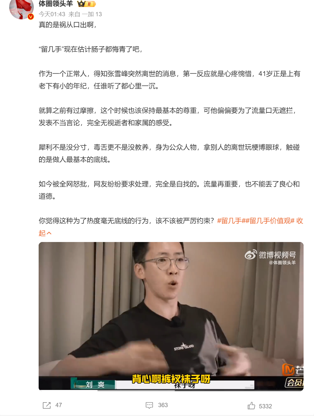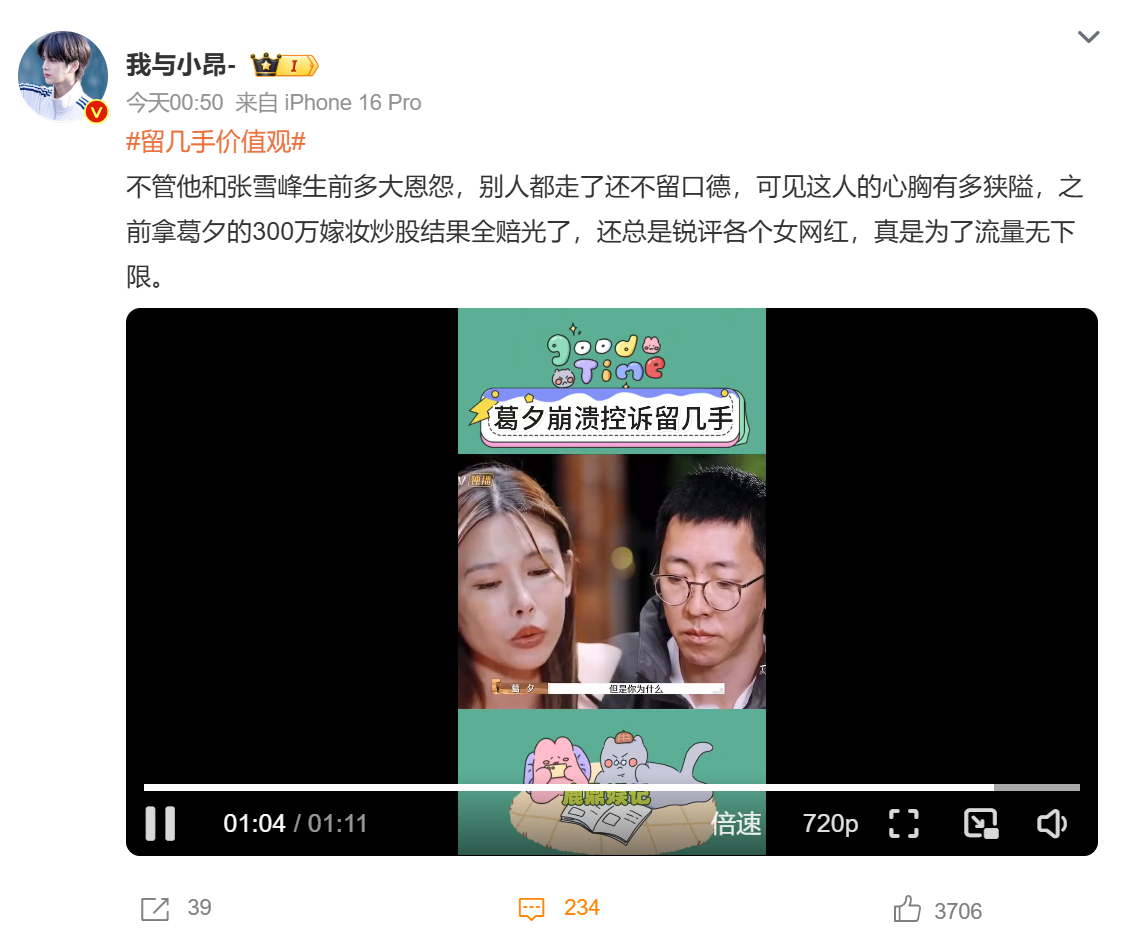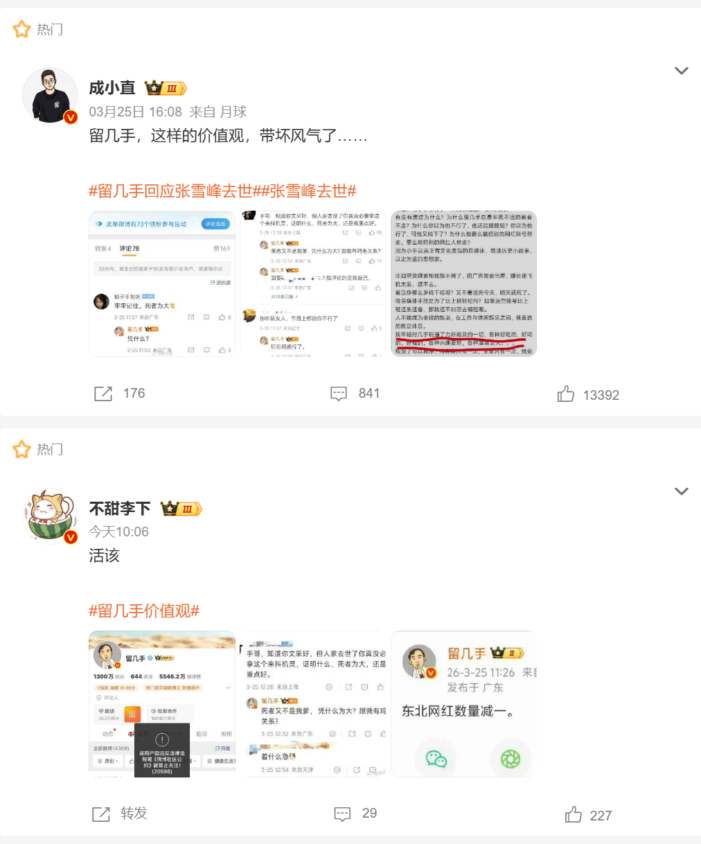 留几手价值观留几手这次的确是惹众怒了,很多不好的过去都被翻出来了,然后已经被禁止关注。不是你流量大就是你有理的,基本的公序良俗大家心里还是有一杠称的。不要被流量裹挟,正确的价值观还是比流量更重要。