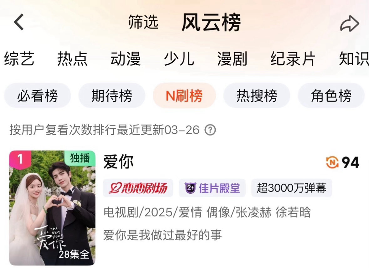 张凌赫两部剧逐玉和爱你占据🥝热播榜前二,爱你N刷榜第一!作品是最大的底气,恭喜这个95顶级扛剧生~