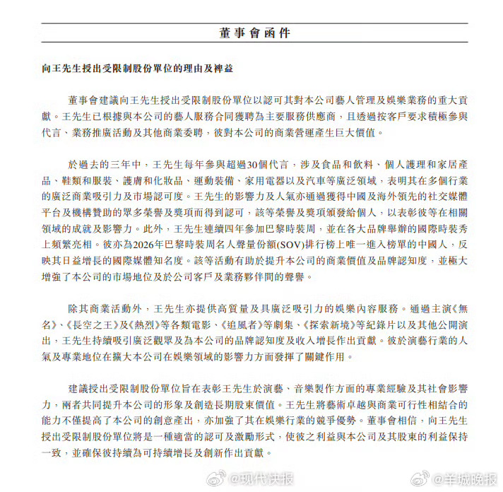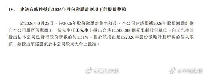 【#乐华拟向王一博授予1250万股股份#】据乐华娱乐2026年3月25日公开的董事会函件,公司建议有条件向授出股份奖励,旨在认可及奖励其对集团业务作出的卓越贡献,寻求维持与王一博的长期合作。函件建议向王一博授出1250万个受限制股份单位,认购价每股0.01港元,占已发行股份约1.51%,相关激励需待股东特别大会审议通过后方可生效。戳更多>>#阚清子和老公一同现身机场##一笑随歌爱奇艺双榜超逐玉##林志玲51岁体态##刘晓庆外甥方否认造谣##葛晓倩怒怼留几手##张凌赫 张家玮#(现代快报)(编辑:张子皓;审签:谢杨柳)