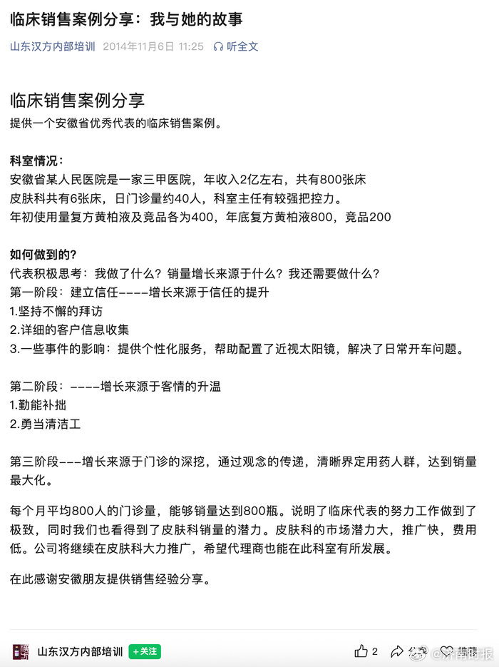 另外,新黄河记者发现,“山东汉方内部培训”公众号在一份发布于2015年初、名为《处方药上量核心问题》的资料中,详细拆解了如何应对医生“对统方结果表示怀疑”“抱怨费用太低”以及“如何送礼以获取首盒处方奖励”等实操话术。(记者杜林)原文:网页链接