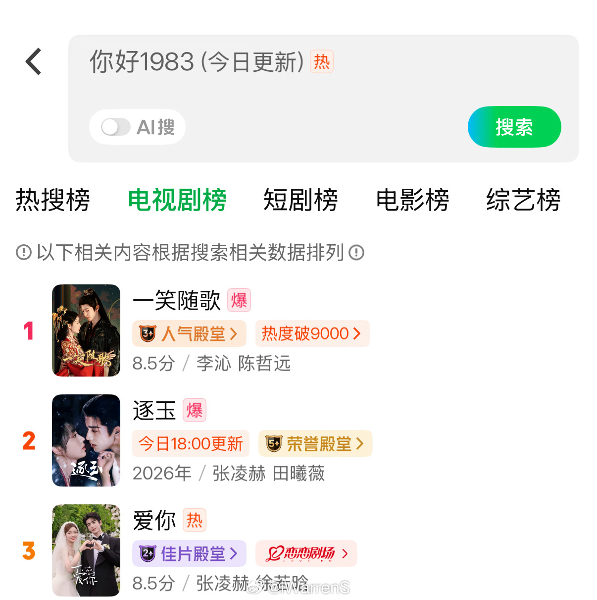 陈哲远一笑随歌爱奇艺站内双榜登顶了;张凌赫两部剧逐玉爱你也进了双榜前三了……一笑随歌爱奇艺双榜超逐玉