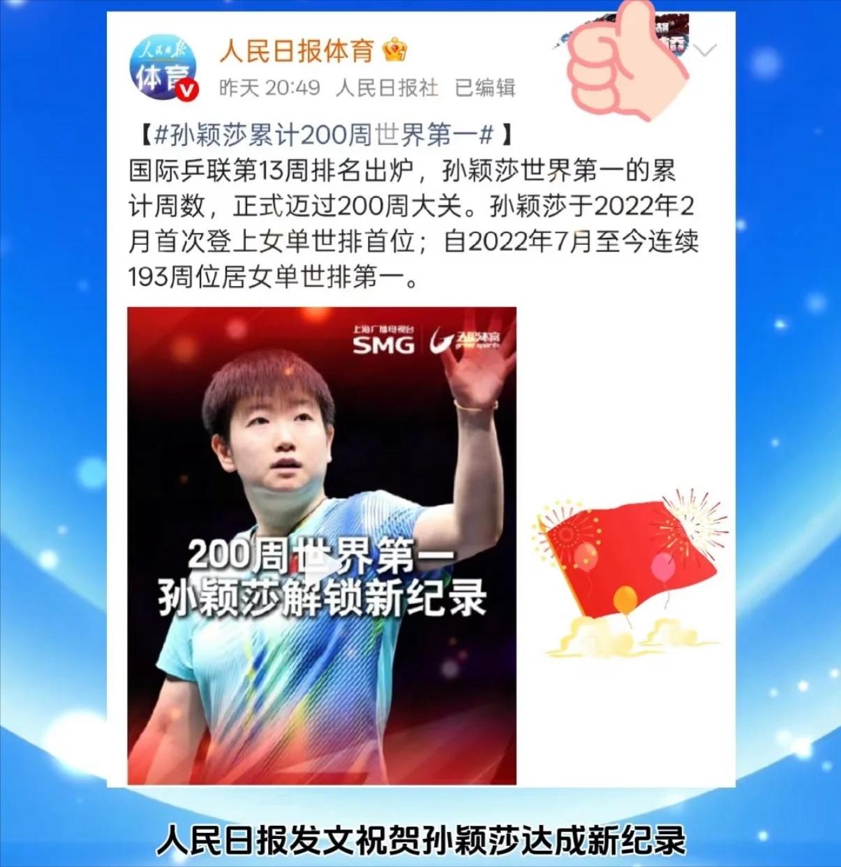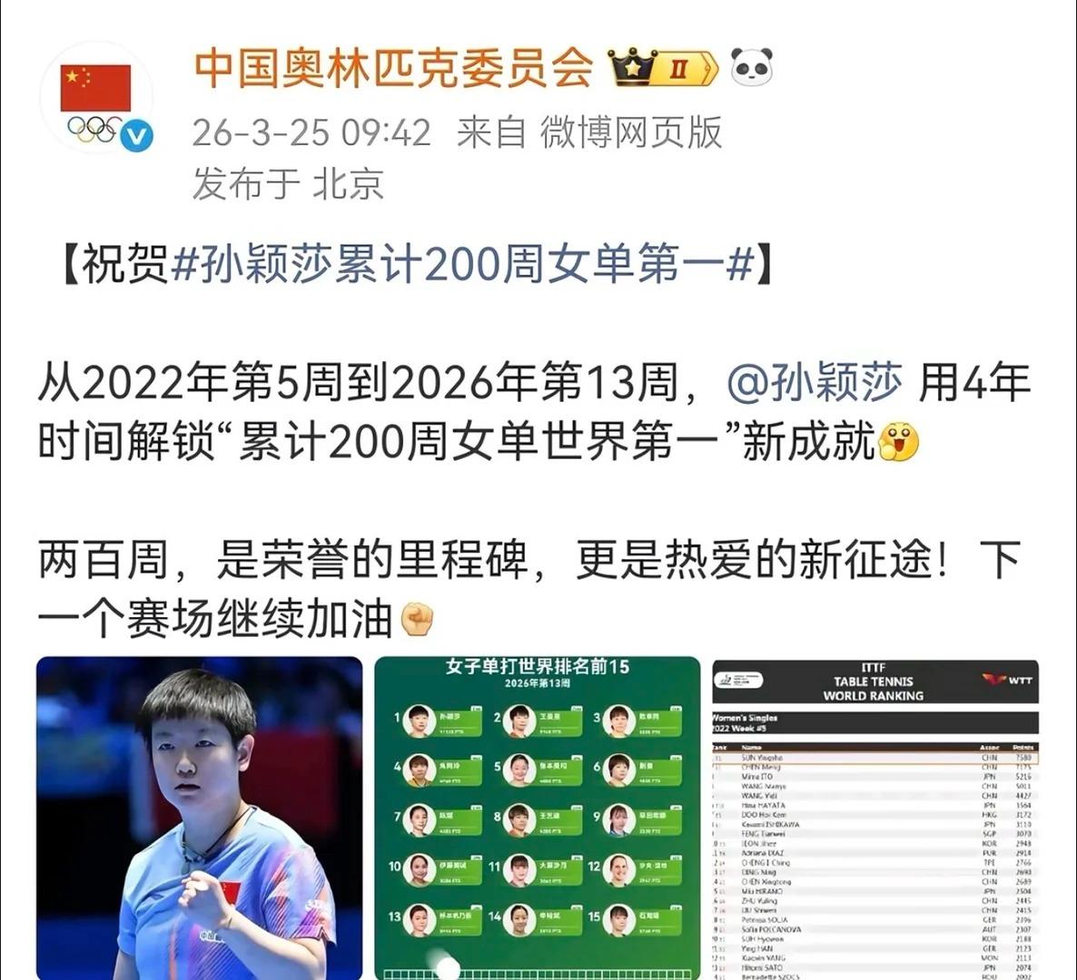 祝贺孙颖莎累计200周女单第一! 从 2022 年第 5 周到 2026 年第 13 周,整整 4 年,200 周女单世界第一! 孙颖莎用绝对实力,在乒坛写下了属于自己的传奇篇章✨ 正所谓打江山难,守江山更难。 每一分都来之不易,每一周都全力以赴。 这 200 周的榜首位置,是日复一日的刻苦训练,是赛场上的每一次咬牙坚持,更是刻在骨子里的极致热爱与担当。 孙颖莎真的用行动证明了什么是 “绝对统治力”! 下一个赛场,继续带着热爱出发,去解锁更多属于你的荣耀吧!💪