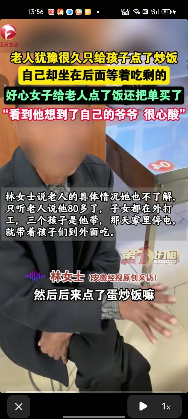 3月25日,凉山州西昌市。女子发视频表示,84岁老人带着三个孙子吃饭,他自己不吃就等孩子们吃剩的。问后得知,他子女在外打工,因家里停电就带着三个孙子到外面吃。随后,自己主动帮老人买单。看着他吃饭,就想到了自己是被爷爷带大的,关于爷爷的回忆在自己的脑海里浮现。 当事人还说,她发现老人眼睛充血也没去医院治疗,就给老人买一盒药