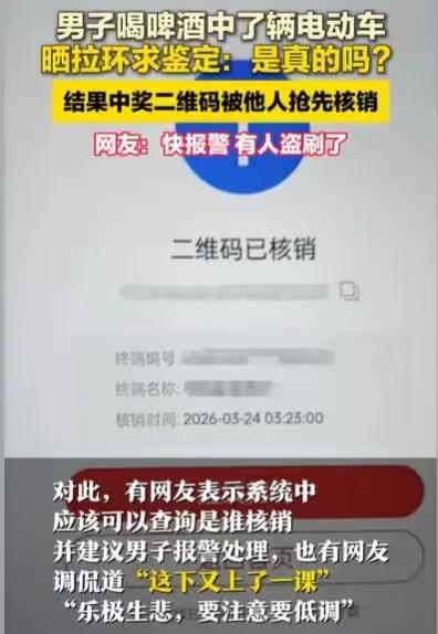“手环中了一辆电动车,发个视频炫耀一下,结果车没了!”男子中奖后高调发视频,二维码被陌生人截走领奖,网友:这波操作亏大了! 内容摘要: 广东肇庆一位男子,喝啤酒时随手拉开手环,居然中了一辆电动车!可他干了一件后悔莫及的事——把中奖手环拍成视频发到网上,让网友帮忙“鉴定真假”。结果等他去领奖时,工作人员说:车已经被别人用视频里的二维码领走了!到手的大奖就这么飞了。这事儿一出,网友吵翻了:别人凭一张截图就能冒领?冒领的人犯了什么法?男子还能不能把车追回来?今天咱们就来聊聊这个“乐极生悲”的故事,顺便给大家提个醒:二维码千万别乱晒! --- 一、中奖的惊喜还没捂热,就被自己“作”没了 广东肇庆一位男子,正跟几个好兄弟聚会喝啤酒。大家喝得正嗨,男子随手打开一瓶啤酒,习惯性地看了一眼拉环。 这一看,他整个人愣住了——手环上写着:中了一辆电动车! 在场的人全炸了锅,纷纷凑过来看。男子自己也懵了,第一反应不是高兴,而是怀疑:这该不会是假的吧? 这时候,他做了一个后悔到现在的决定——他没有先去核实兑奖流程,而是掏出手机,把手环拍了个视频发到网上,让网友帮忙“鉴定真假”。 视频一发出去,点赞评论蹭蹭涨,大家都在恭喜他。男子心里美滋滋的,想着等确认了就去领车。 结果等他搞清楚兑奖规则,跑去兑奖点时,工作人员一句话把他打懵了:“不好意思,车已经被领走了,昨天就有人拿着二维码来兑过了。” 男子这才反应过来——他把手环拍成视频发到网上,手环上的二维码清清楚楚露在外面,被人截图拿去领走了! 网友看完这事,纷纷评论:“闷声发大财,才是硬道理!”“中奖这种事,千万别发朋友圈,更别发短视频!” --- 二、法律分析:别人凭截图领走车,算偷还是算骗? 这件事表面看是个闹剧,但从法律角度仔细一琢磨,有好几个点值得说道。 1. 冒领的人,犯了什么法? 很多人第一反应是:这不就是偷吗? 但仔细分析一下,盗窃的典型特征是“秘密窃取”,也就是趁人不注意把别人占有的财物偷偷拿走。可在这个案子里,男子是自己把二维码公开到网上的,冒领的人并没有“偷”二维码,只是看到了一个公开信息拿去用了。 这种行为,在法律上更倾向于认定为诈骗。为什么?因为冒领的人用虚假身份,让兑奖点工作人员误以为他就是中奖人,从而把车交给他。这就符合诈骗罪的构成要件:虚构事实、隐瞒真相,让受害人基于错误认识处分财产。 2. 电动车值多少钱,决定冒领的人会不会坐牢 根据《刑法》第二百六十六条,诈骗公私财物,数额较大的,处三年以下有期徒刑、拘役或者管制。数额较大的标准一般是3000元以上。 如果这辆电动车价值超过当地立案标准,冒领的人就可能涉嫌诈骗罪,要承担刑事责任。即便没达到刑事立案标准,至少也构成民事侵权,属于“不当得利”,男子可以起诉要求返还或赔偿。 3. 兑奖点有没有责任? 这得看兑奖规则。如果规则明确写着“凭二维码兑奖,不核实身份”,那兑奖点没责任。但如果规则要求“凭中奖手环+身份证”才能兑,那兑奖点就有审核不严的过错,需要承担相应责任。 --- 三、男子能不能把电动车追回来?答案是:能 这事儿虽然闹心,但男子也不是完全没辙。 第一,报警。 这是最直接的办法。如果电动车价值达到立案标准,就属于刑事案件。警方可以通过兑奖记录、监控录像找到冒领的人,车就能追回来。 第二,找活动主办方交涉。 如果兑奖点在核销过程中存在审核不严的问题,主办方也有责任。男子可以要求主办方提供兑奖记录,查明是谁冒领的。 第三,起诉冒领的人。 如果知道是谁,男子可以直接去法院起诉,要求返还电动车或者赔偿损失。中奖手环在他手里,视频发布记录也在,胜诉的可能性很大。 所以说,虽然男子自己犯了“高调”的错误,但法律还是站在他这边的。只要及时行动,车大概率能要回来。 --- 结论:中奖是运气,守住奖才是本事 这个故事看完,估计不少人都在替这位大哥惋惜。但也得说句实在话:这事儿真的只能怪他自己。 中奖这种事,说到底是个人隐私,跟银行卡密码、身份证信息一样,不该随随便便往外晒。你发个视频,本意是想炫耀一下,结果被有心人钻了空子,直接给你“截胡”了。 好在法律上还有补救的办法。但折腾这一圈,原本开开心心的一件好事,硬是变成了一场麻烦。 最后,想问问大家: 如果你中了这样一辆电动车,你会第一时间发朋友圈炫耀,还是默默去把车领回家?你觉得兑奖点只凭二维码就让人领走车,这个规则合理吗?欢迎在评论区聊聊你的看法。 来源: 综合自广东肇庆本地媒体报道、网友分享