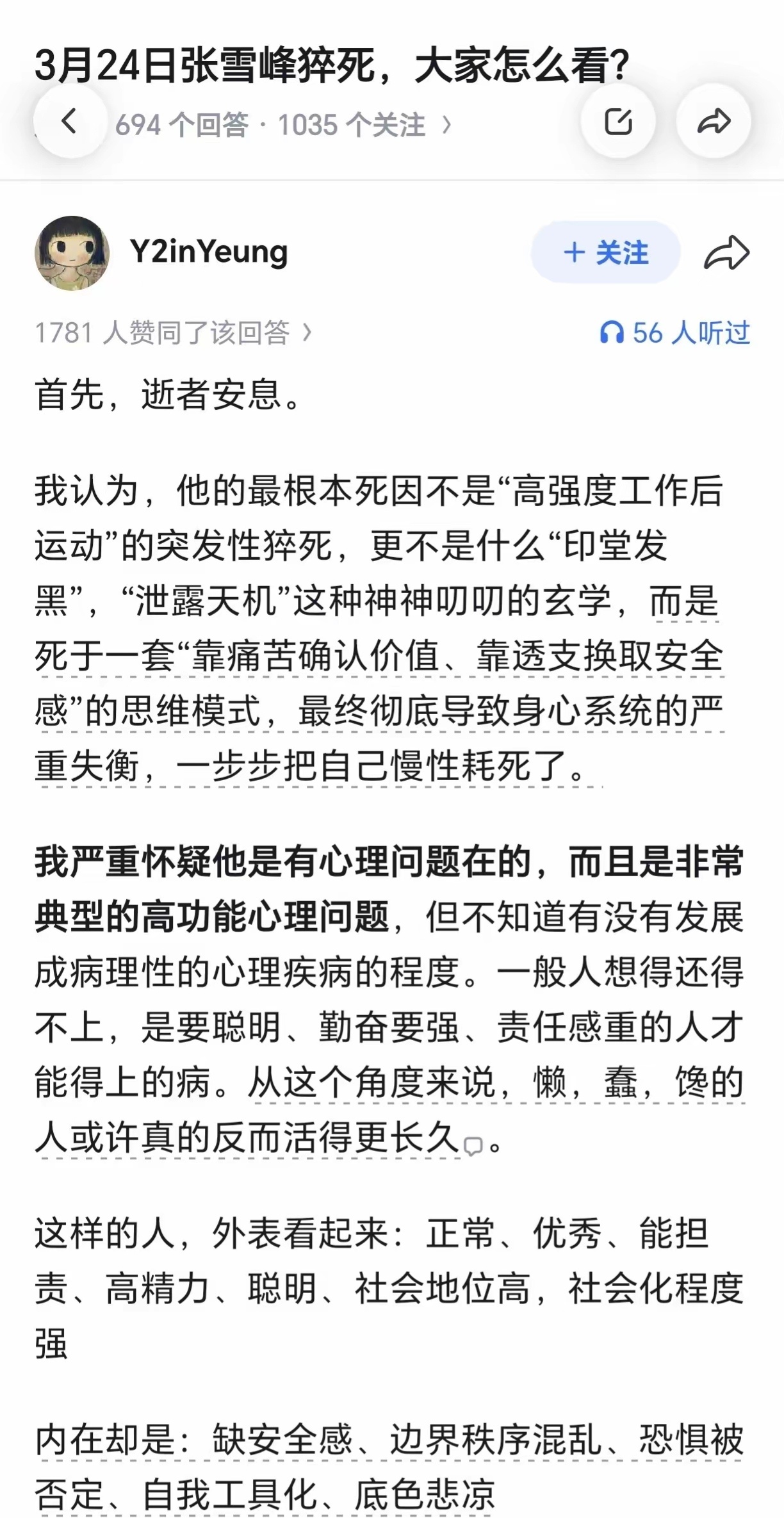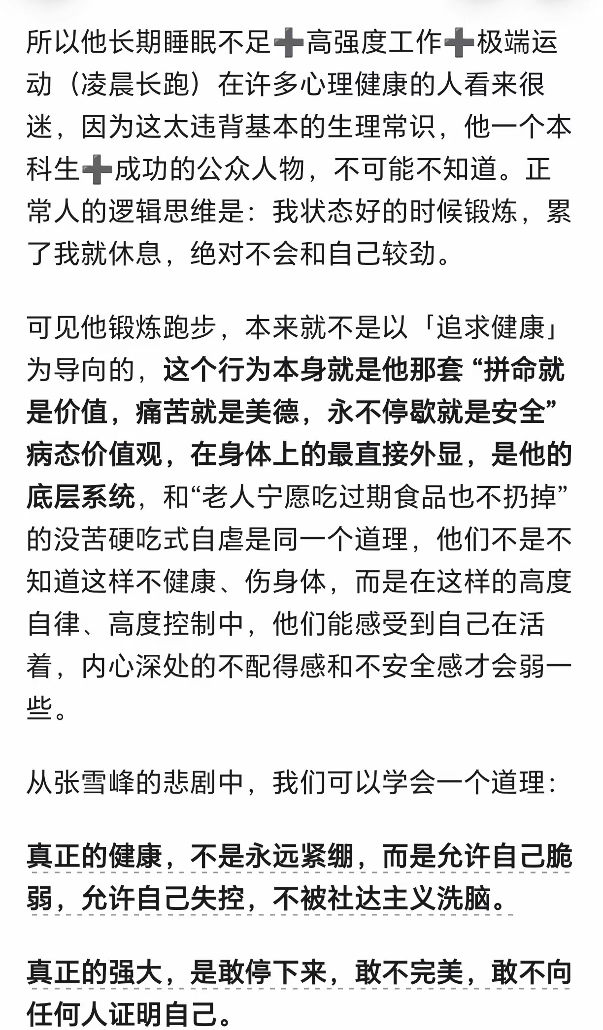张雪峰代表了从底层奋斗成功的一批人,高强度的自律,以伤害身心为代价获得名利,最终把自己内耗到油尽灯枯。
