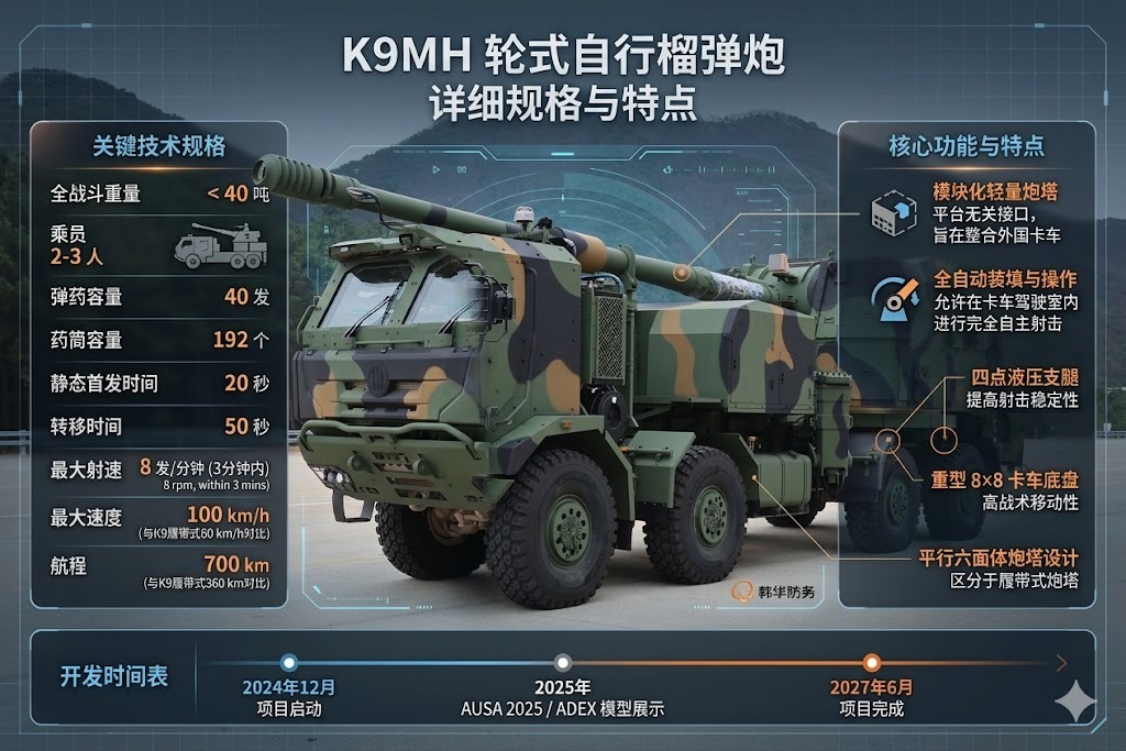 韩国韩华宇航公司 K9MH 155毫米轮式自行榴弹炮,韩华宇航正推进K9系列火炮“双路线”:一是履带式持续升级(K9A2/A3),二是重点发展的轮式K9MH,明显瞄准未来作战环境与MD三等人换代需求。K9MH采用8×8卡车+模块化炮塔方案,强调平台无关、低后勤负担和本地化生产,甚至已面向美军下一代火炮项目展开竞标与测试。军事ai新视野 全球武器装备盘点